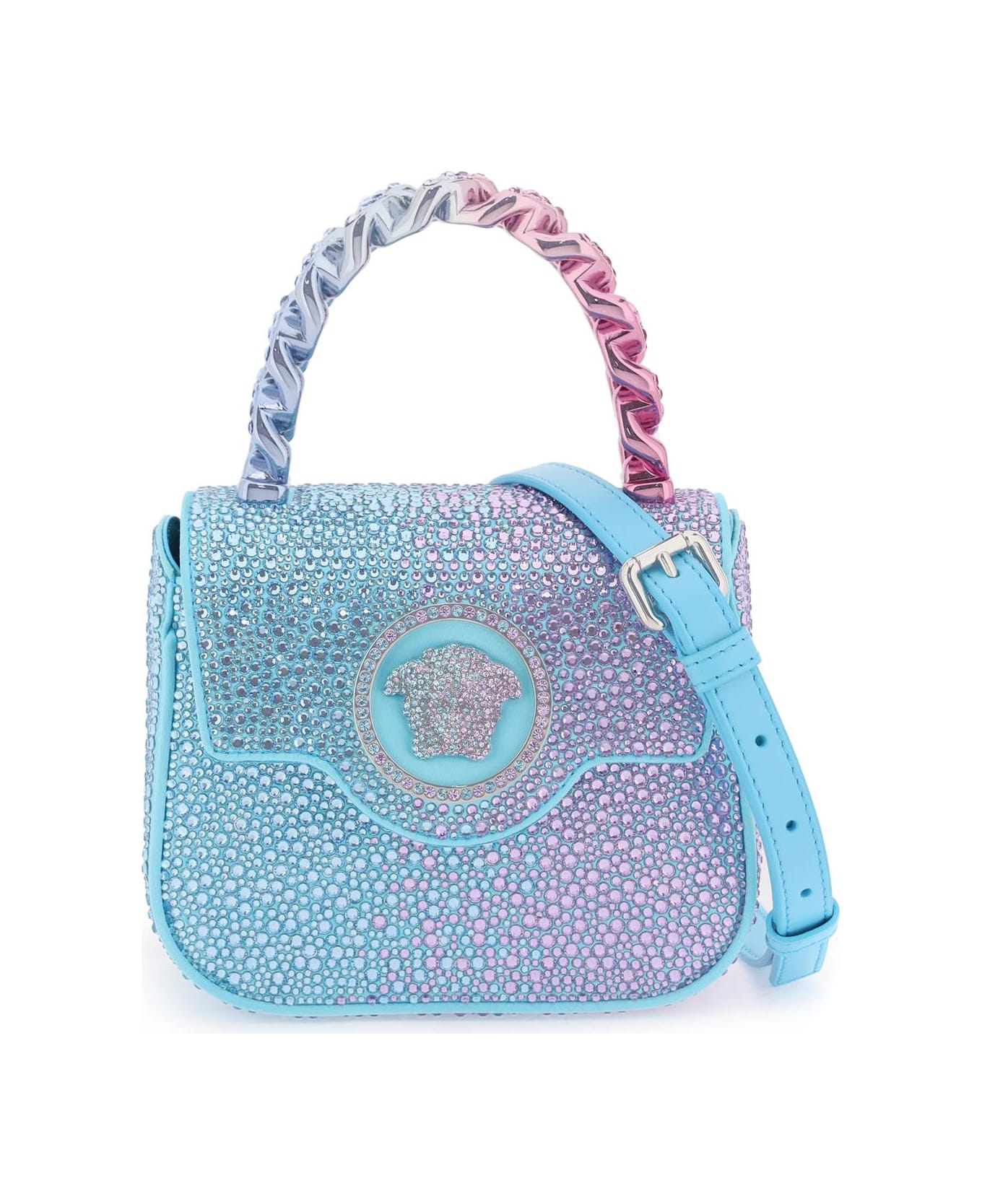 La Medusa mini bag by Versace crafted in silk-blend satin studded with crystals, enriched by the iconic matching Medusa head and characterized by the rigid chain top handle. Equipped with a detachable and adjustable shoulder strap. Magnetic closure, nappa leather lining, three inner credit card slots.