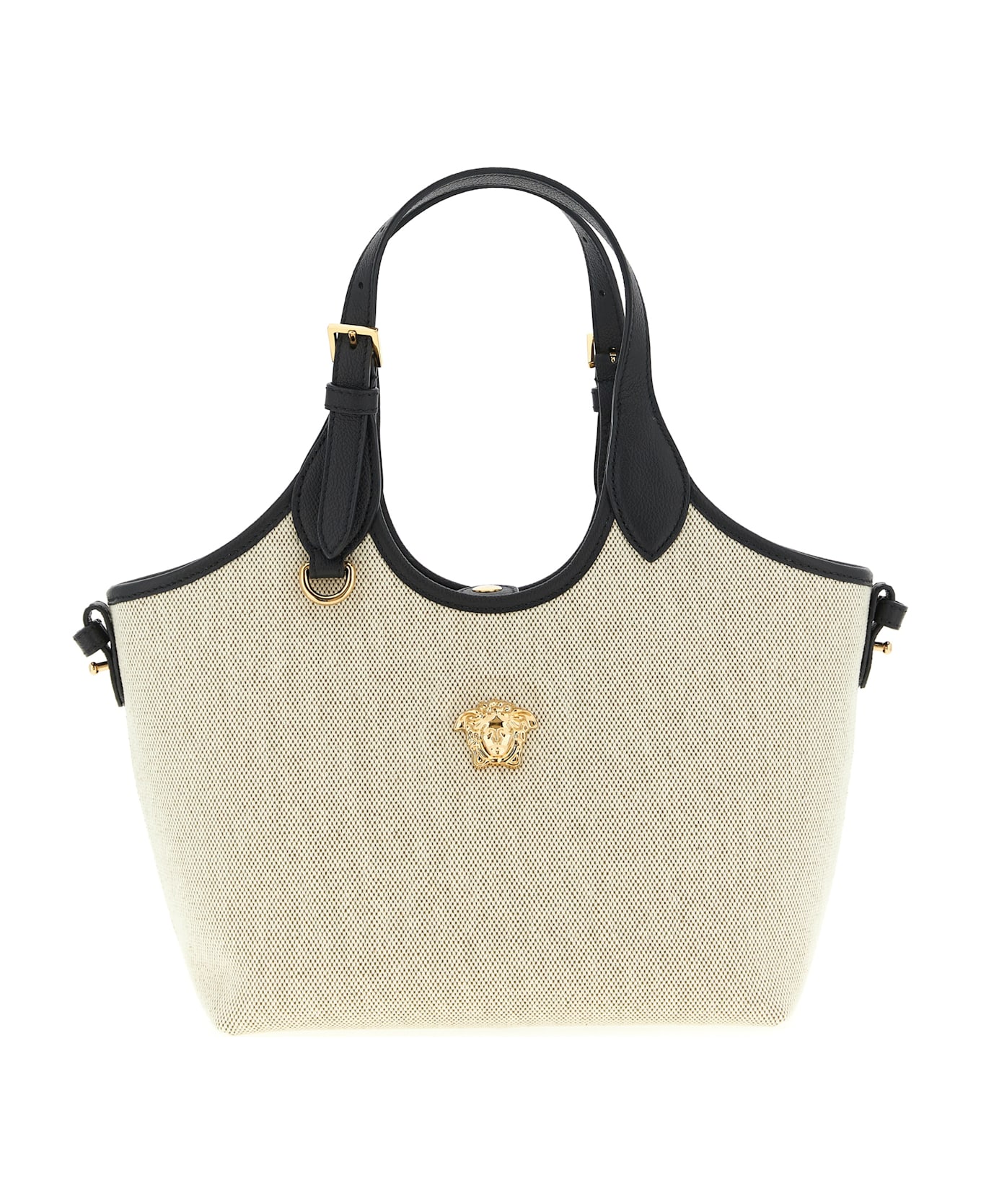 Canvas mini shopping bag with contrast leather details, metal 'La Medusa' detail and front 3D logo, double adjustable handle, internal snap button closure, rigid base with metal feet, adjustable and removable shoulder strap. Composition: 100% cotton