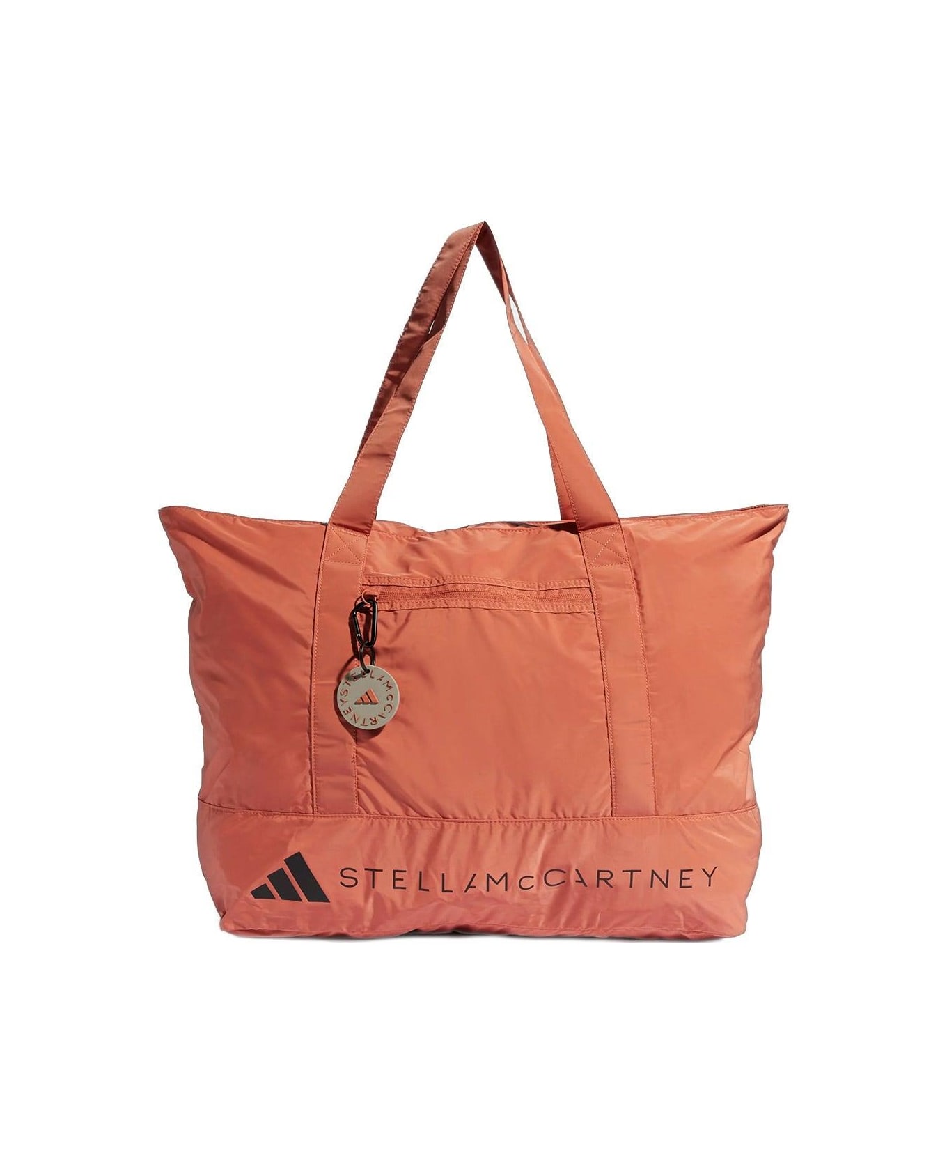 Adidas By Stella McCartney tote bag in gear pink recycled polyester with top handles, black logo printed on the sides, external zip pocket with black carabiner and rubber logo and top zip closure.