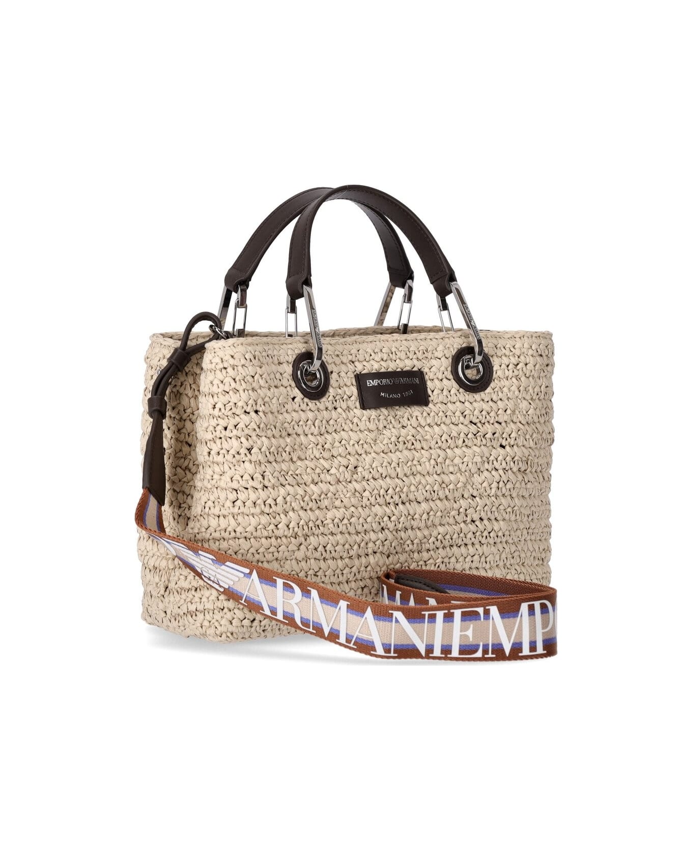 MyEA shopping bag by Emporio Armani made of woven raffia in shades of beige. Interior with two compartments divided by a removable zip pouch, adjustable and removable shoulder strap in logoed fabric and front logo. Details in silver metal and magnetic closure, measures 26x20x10 cm. Composition: 100% textile paper.