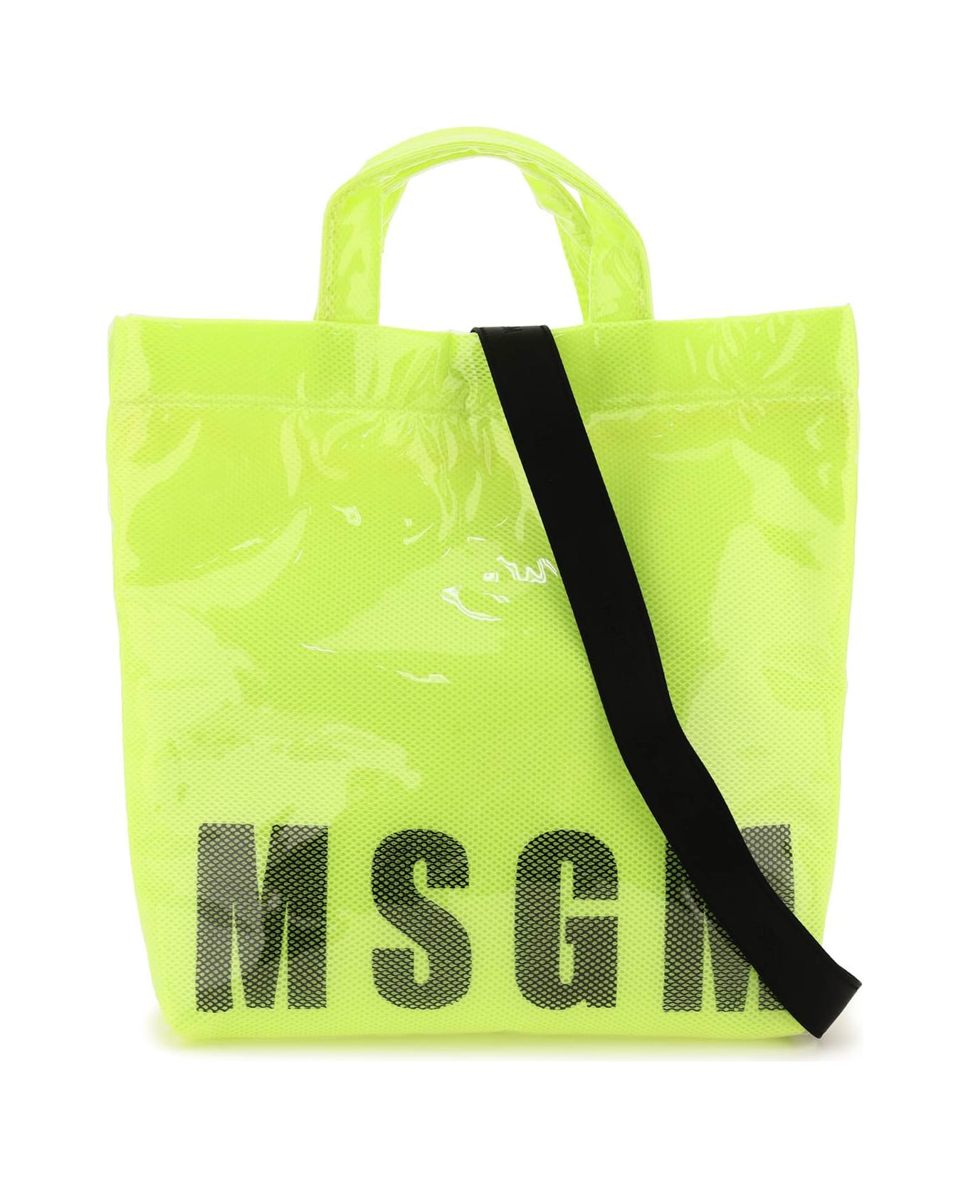 MSGM tote bag crafted in transparent PVC covered mesh with contrasting logo on front, double top handle and detachable jacquard webbing strap with logo. Magnetic button closure, cotton-blend fabric lining and one inner open flat pocket.