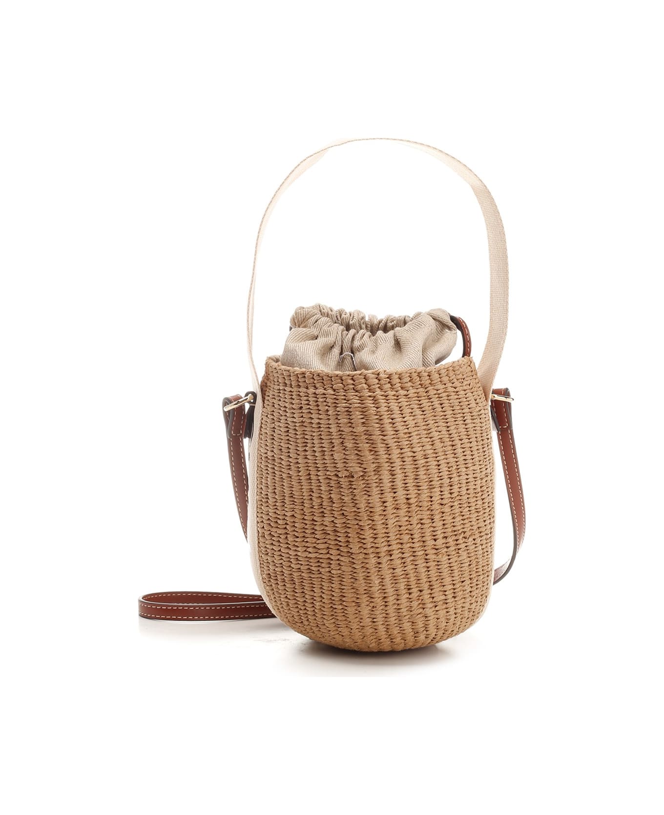 "Sense" bucket bag from Chloè in straw, brown leather and canvas, with adjustable shoulder strap, internal main compartment with drawstring bag.