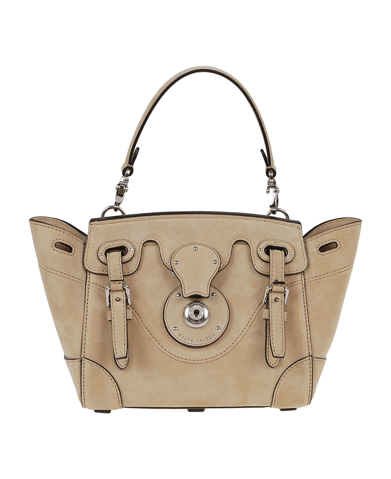 Soft Ricky bag in suede calfskin BY RALPH LAUREN. Two top handles; inside zip pocket and two slip pockets. Removable and adjustable leather shoulder strap. Featuring a flap front with the signature Ricky clasp and a removable leather key ring.