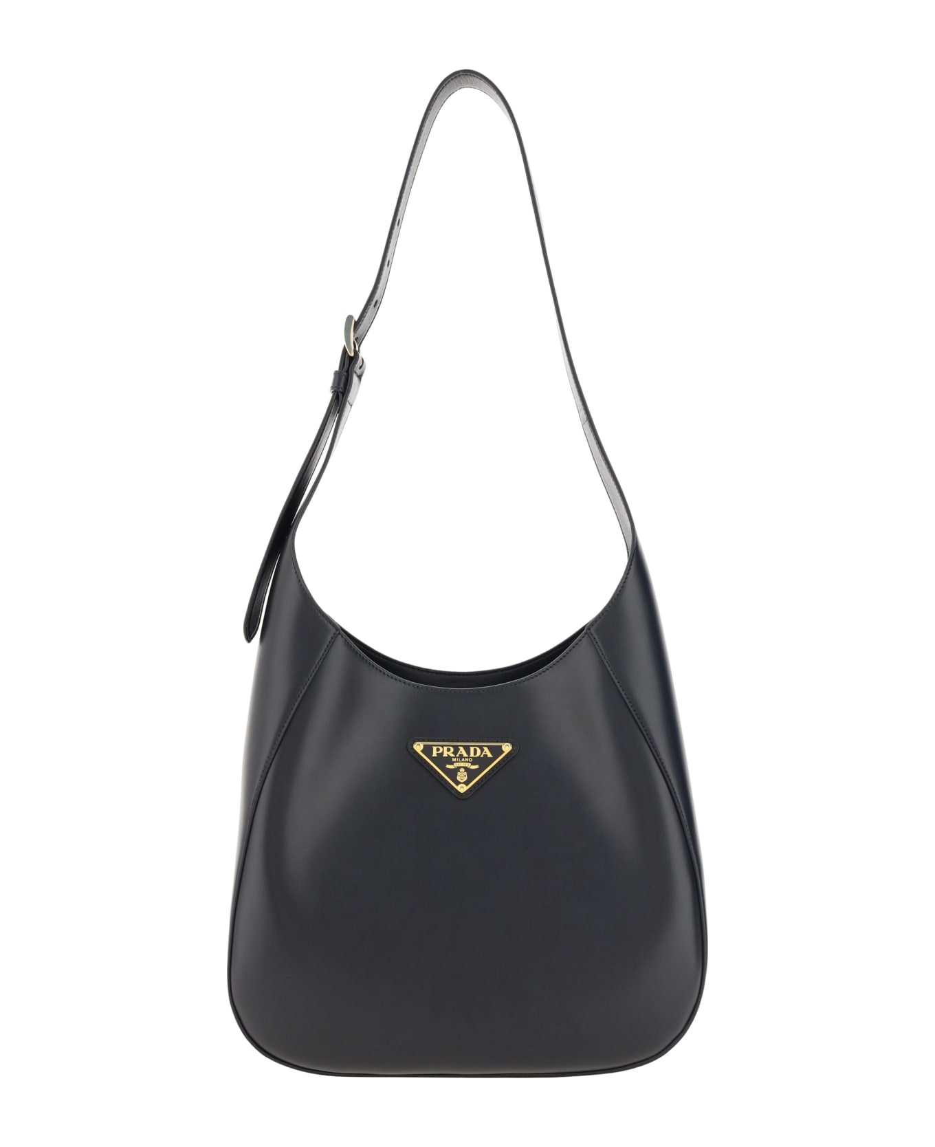 Calfskin shoulder bag by prada, unique design, adjustable flat shoulder strap, smooth leather finish, iconic enameled triangular plaque with brand signature applied on the front, single internal compartment. Composition: 100% % Calf Leather Bos Taurus