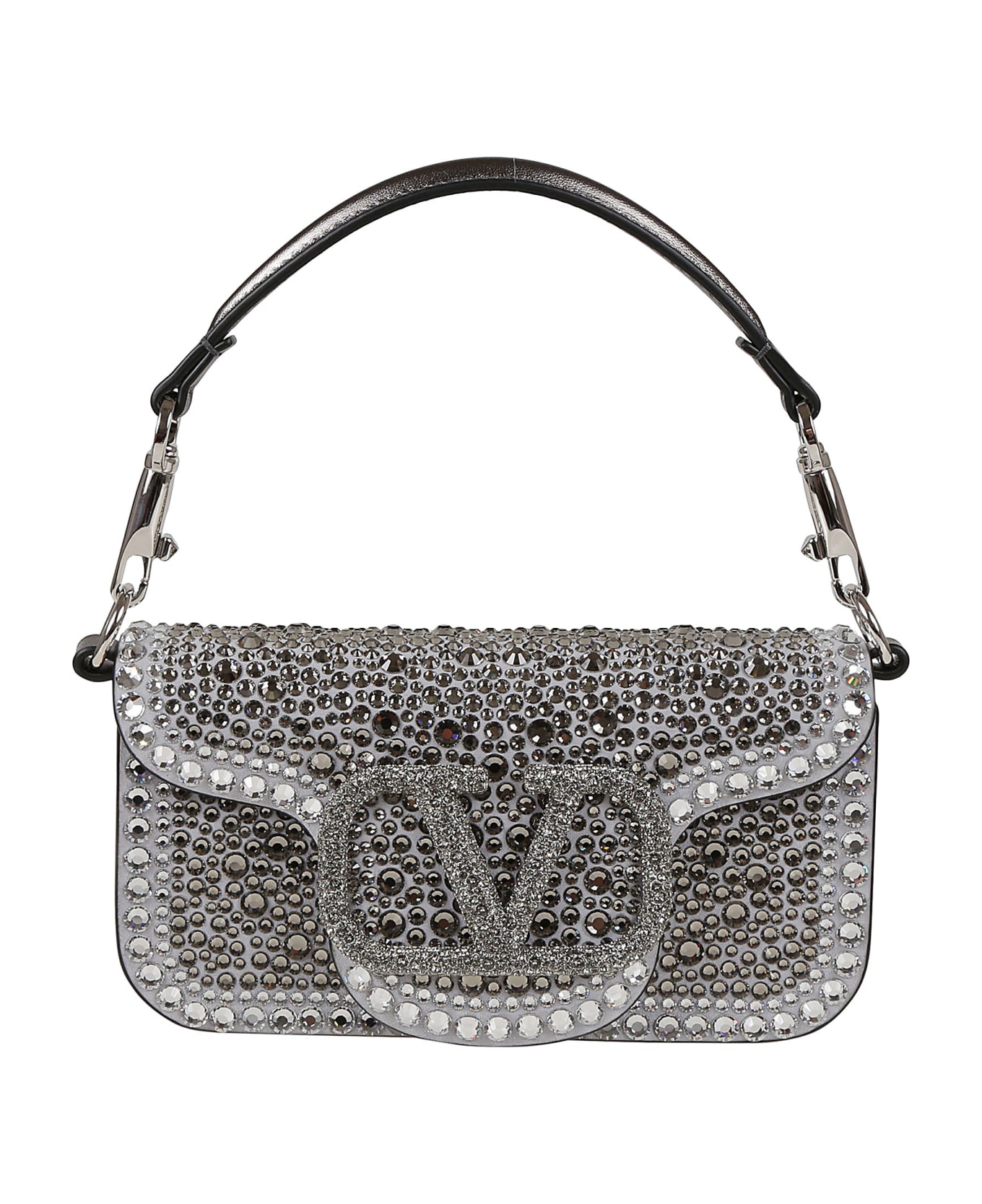 Locò shoulder bag in denim with rhinestone application and VLogo Signature element covered in rhinestones BY VALENTINO GARAVANI. Magnetic closure; a flat pocket inside. Featuring VLogo Signature on the front. Detail covered in crystals. Ideal to be worn both on the shoulder/cross-body thanks to the sliding and removable chain; or by hand thanks to the removable handle.