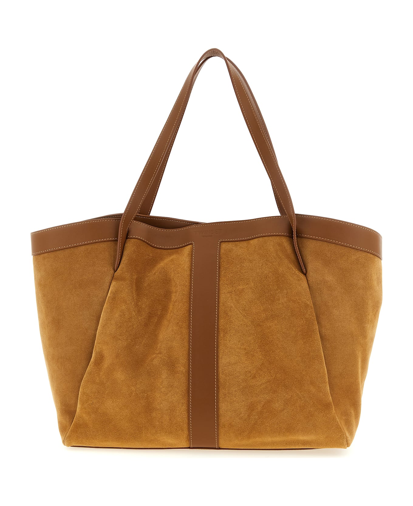 Tone-on-tone suede and smooth leather shopping, front embossed logo, double fixed handle, magnetic closure.