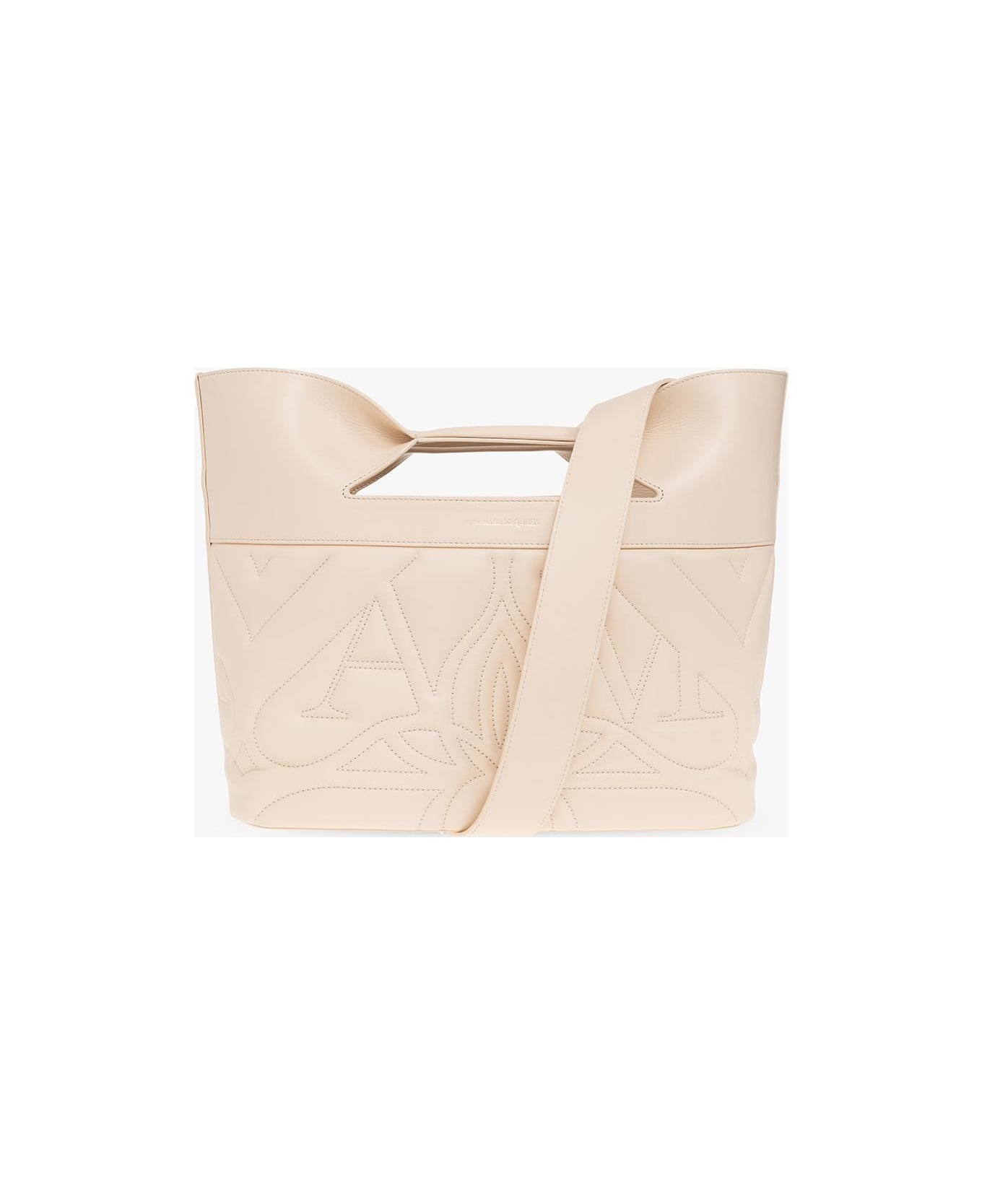 Cream 'The Bow Small' shopper bag from Alexander McQueen. Made of calf leather, this model features a magnetic snap, gold-tone logo print, quilted logo pattern, two handles, detachable shoulder strap, gold-tone metal hardware and one internal compartment