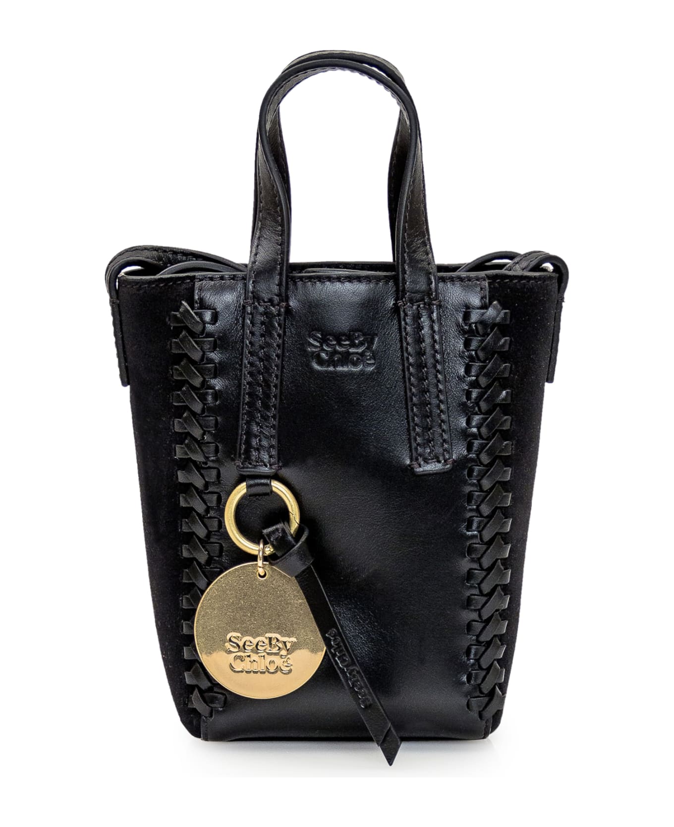 Handbag. Two handles. Shoulder strap. Snap button closure. Metal patch with logo.