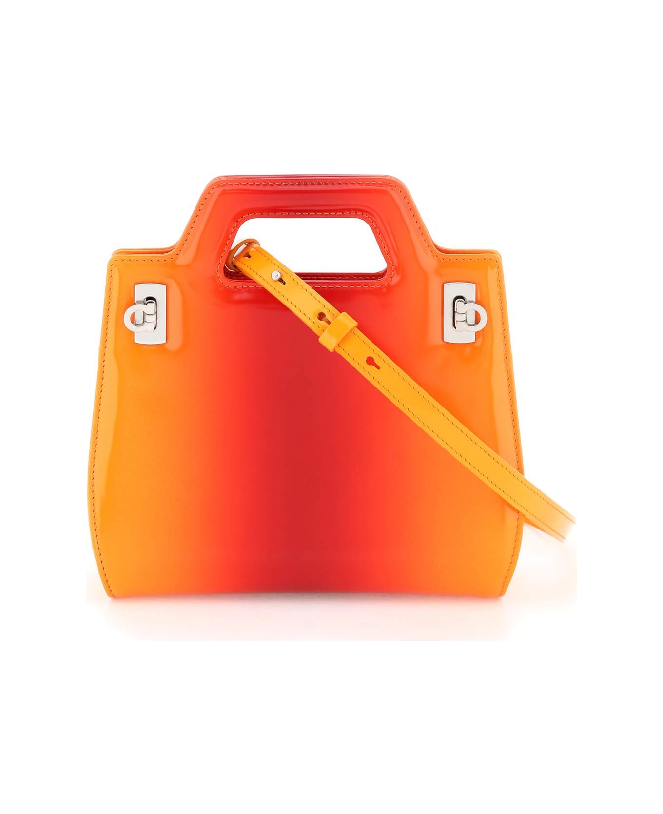 FERRAGAMO 'Wanda' mini bag crafted in nuanced glossy leather with geometric lines. Gancini side buckle closure, smooth leather interior with two credit card slots and adjustable, detachable shoulder strap. Satin steel-finished metalware. Composition: 100% calf leather