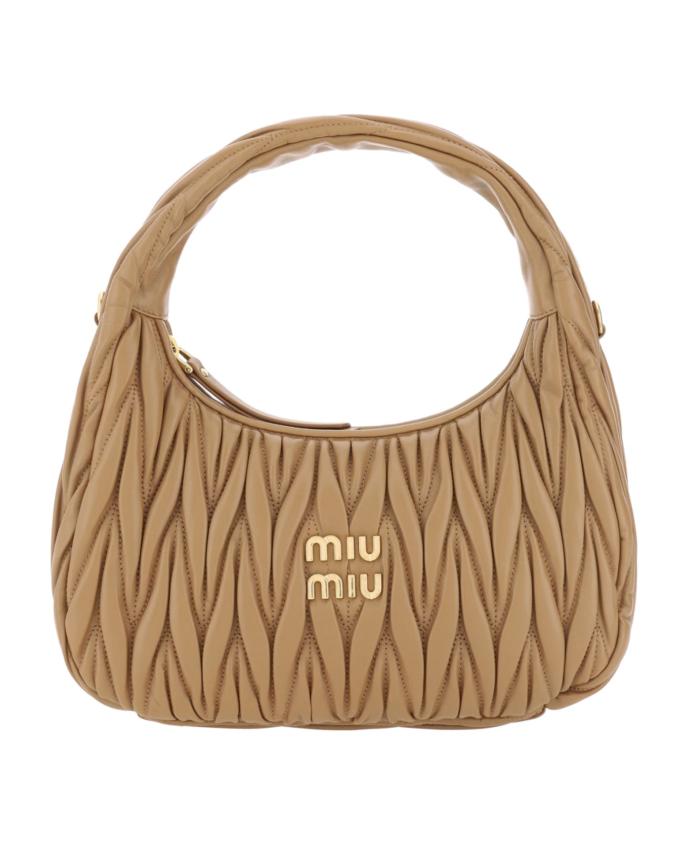 Lambskin wander shoulder bag by miu miu, quilted effect, contrasting embossed iconic brand monogram applied to the front, top zip closure, main compartment, iconic brand logo plaque applied to the interior, removable flat leather shoulder strap to attach to side panels.