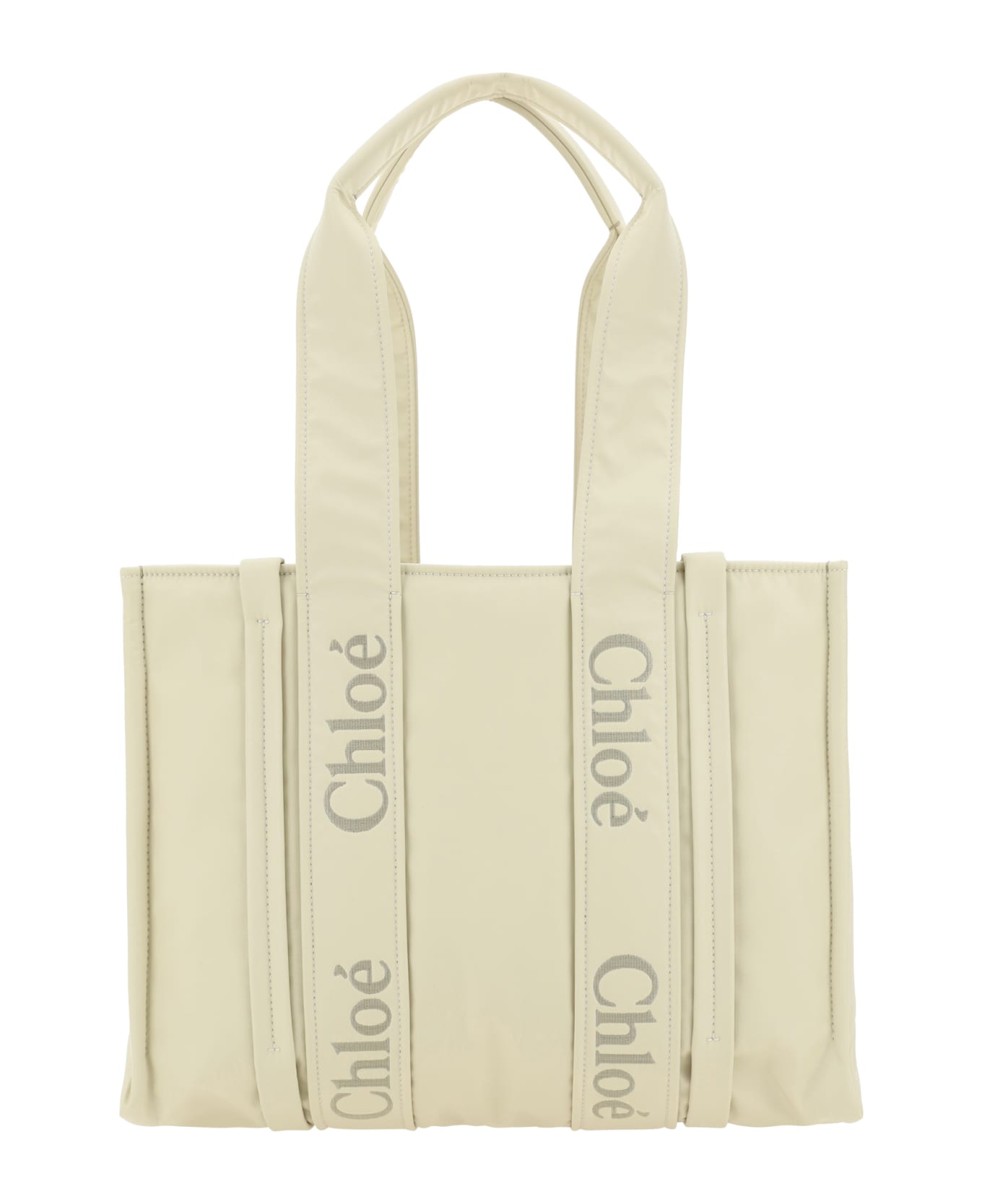 Woody handbag by chloé, double stiff handles at top, applique and logoed handle extensions along side panels, matching flat nylon shoulder strap, single interior compartment. Composition: 40% % Polyester, 30% % Polyamide, 30% % Polyurethane