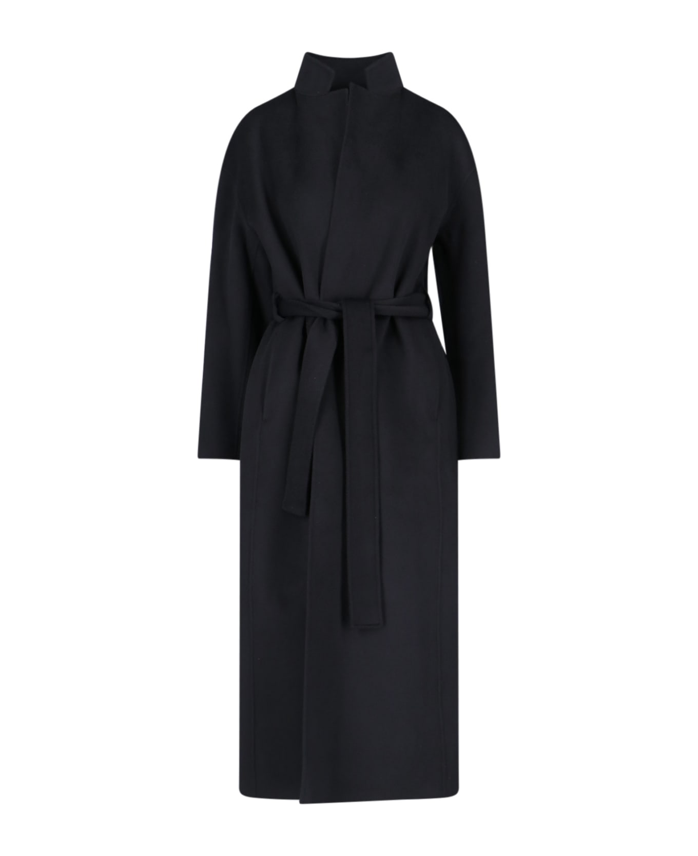 Filippa K Alexa midi coat in black merino wool and cashmere with open front design, high neck, tone-on-tone belt at the waist, two side pockets, and straight hem.