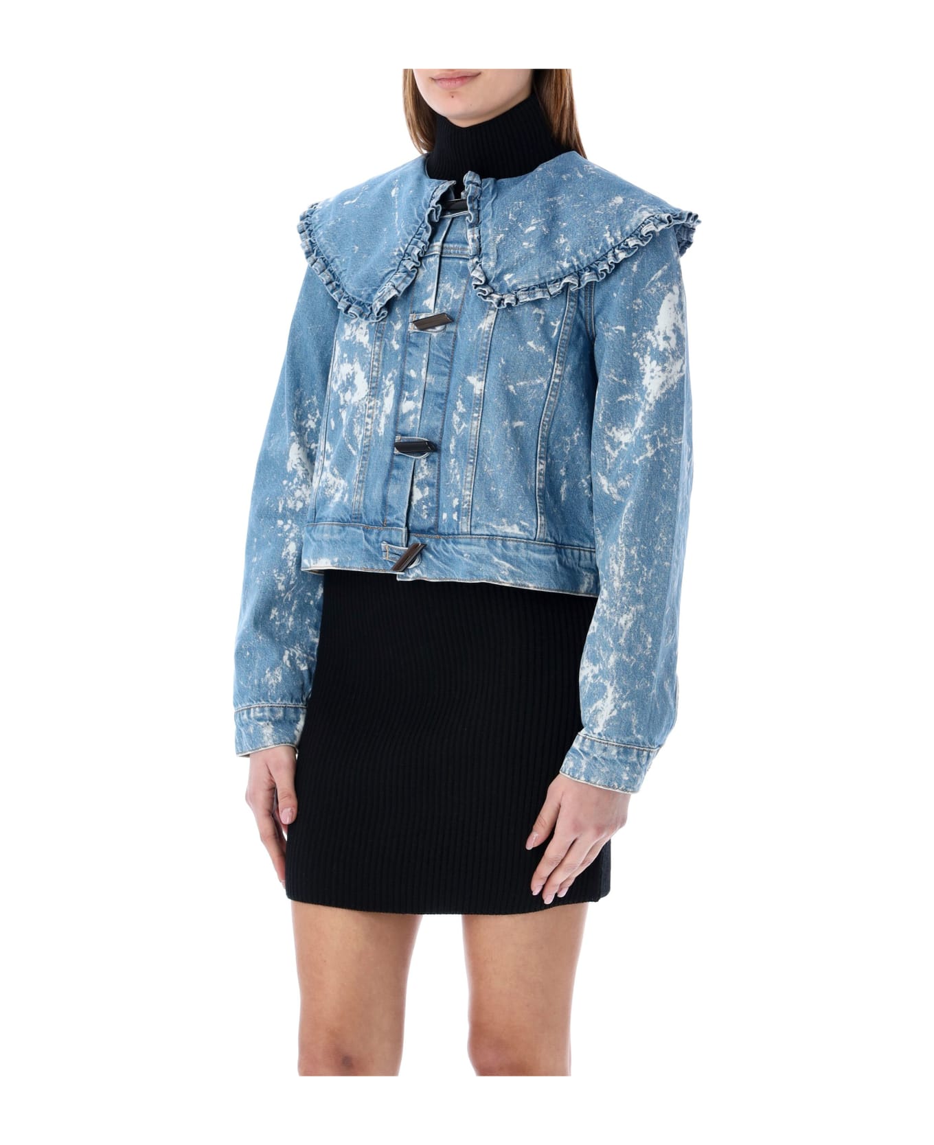 Bleach Denim Cotton Ruffle Collar Denim Jacket By Ganni. Featuring: