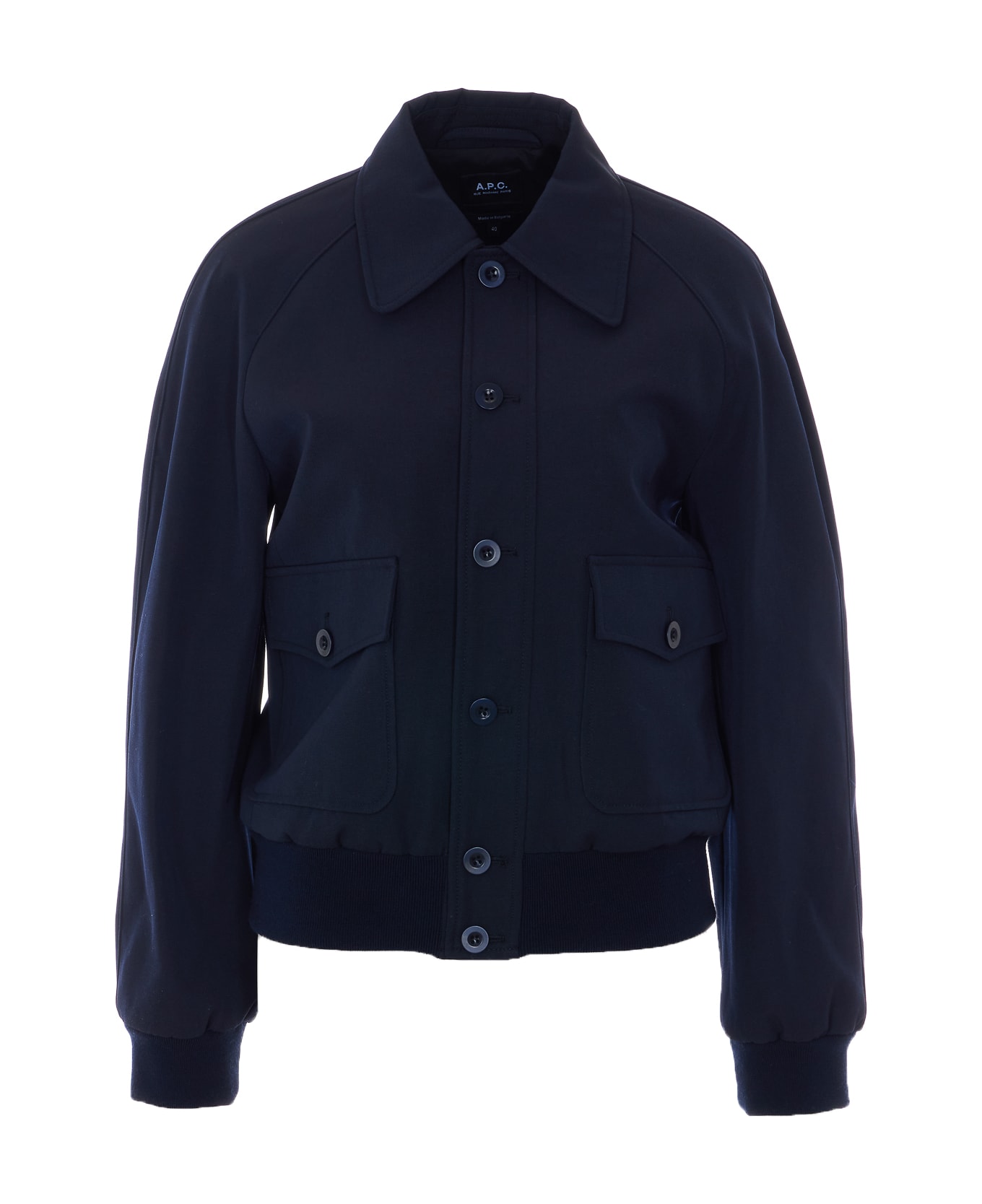 A. P. C. dark navy jacket with frontal buttons closure, long sleeves, regular collar, pockets with button closure, elasticized on waist and on cuffs