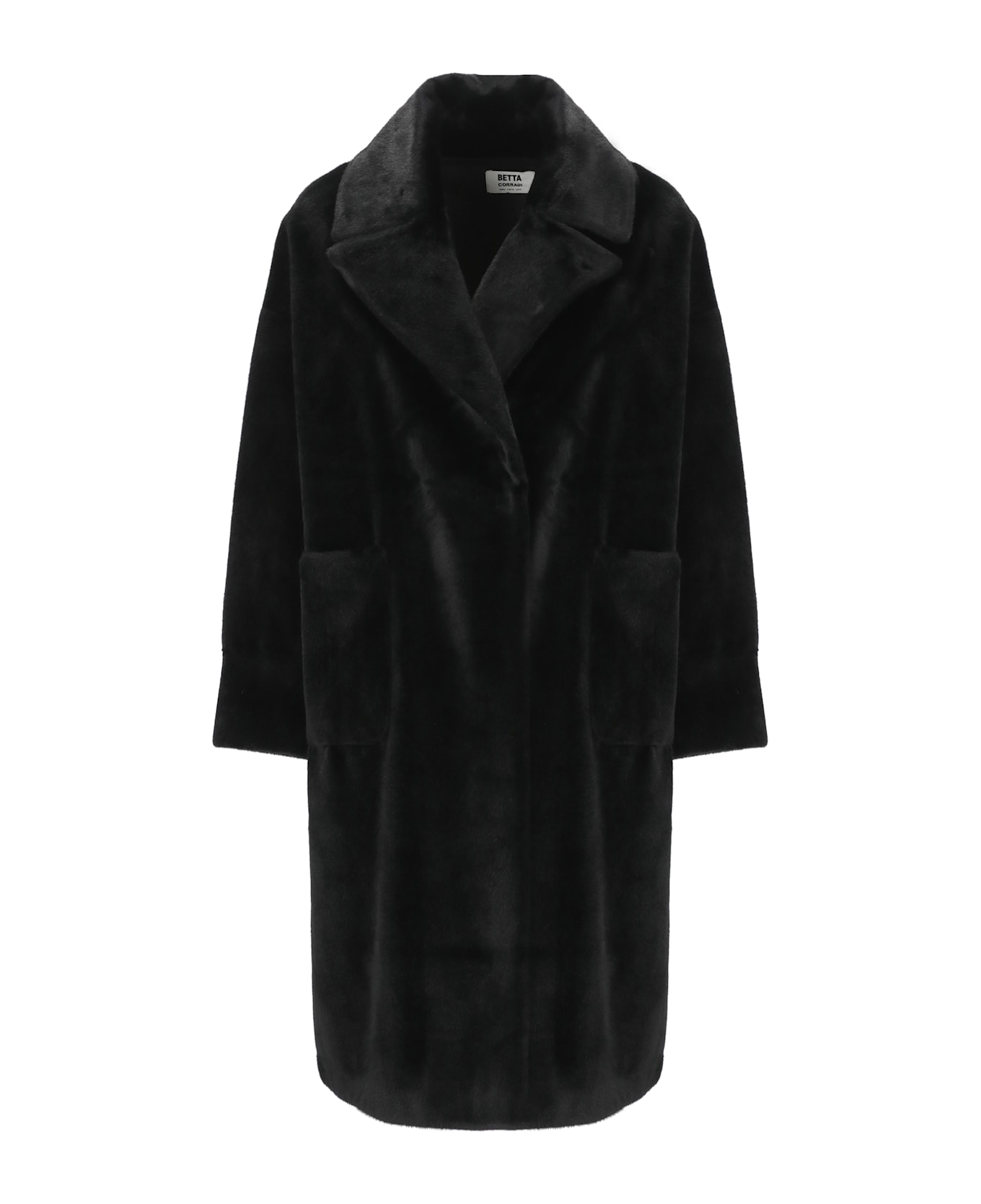 - Betta Corradi woman's black faux fur double-breasted coat - Lapel collar - Long sleeves - Two front welt pockets - Front buttons fastening