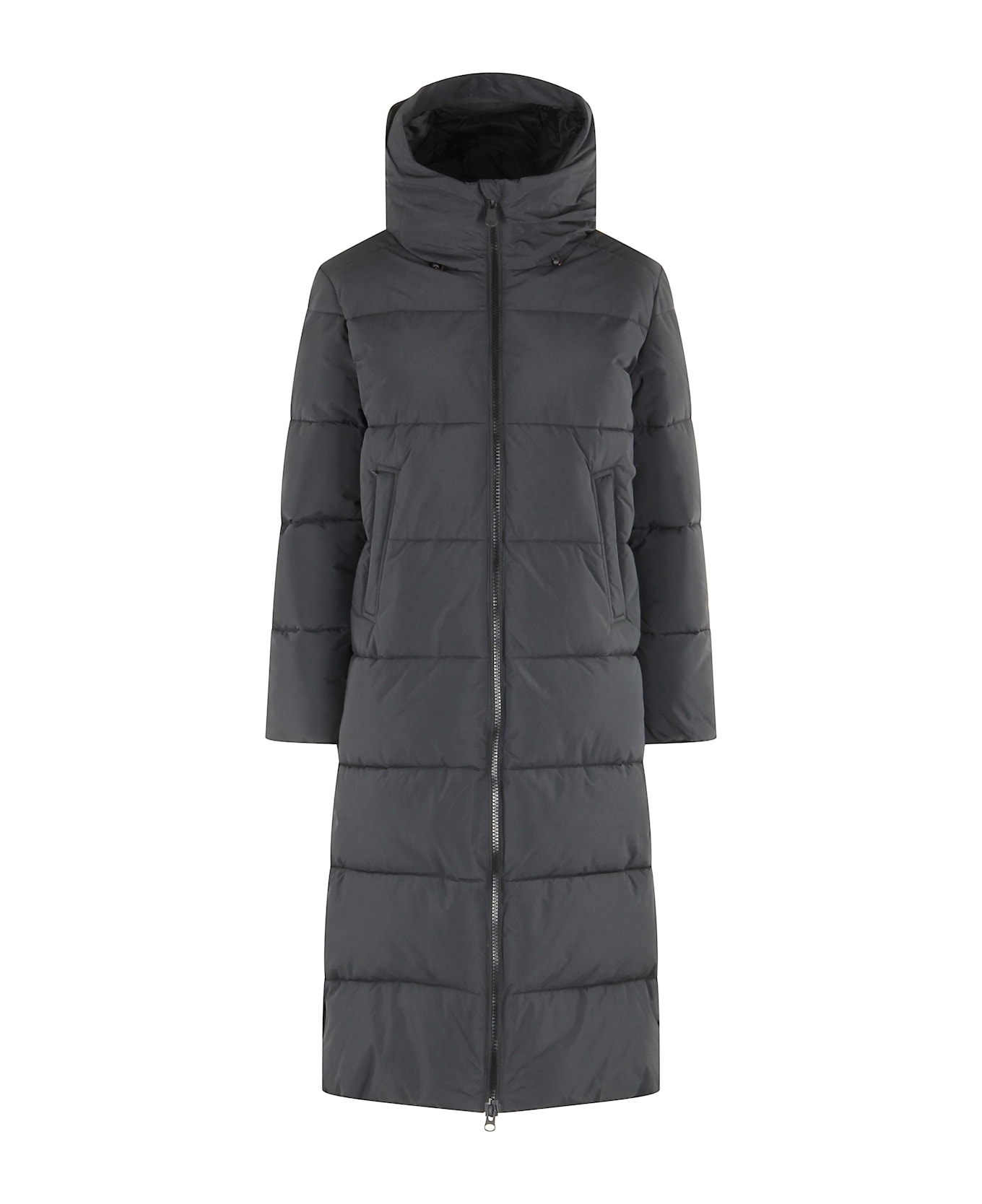 Coat - Save the duck - Black color - Removable hooded collar - Quilted and padded - Adjustable side slits with snap buttons at bottom - Inside lycra cuffs - Flush pockets with side zippers - Inside pockets.