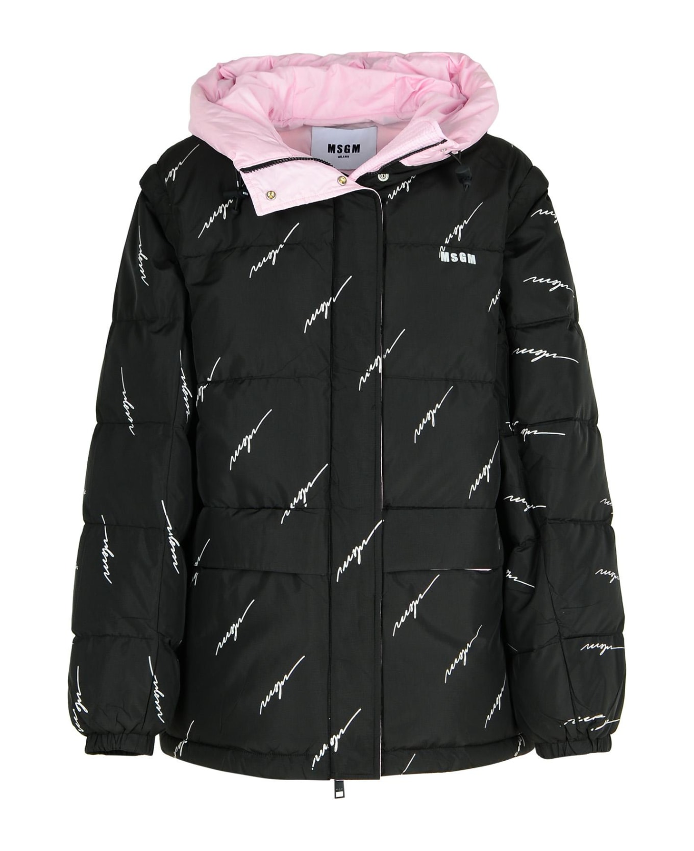 Drawstring hood, pink trimming, pink lining, zip and button closure, contrast serial logo signature, drawstring at the hem, two side pockets, removable zip sleeves Composition: 100% polyester
