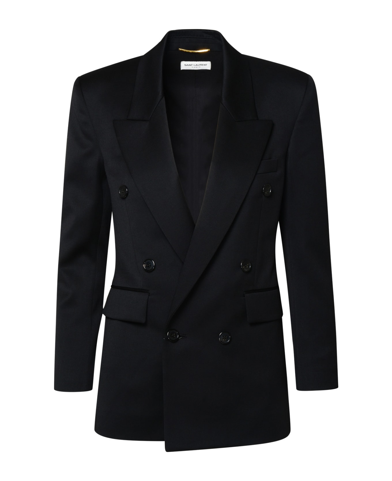 Double-breasted blazer with padded shoulders, lapel collar, chest pocket, flap pockets on the front, cuffs with buttons on the spot, split on the back