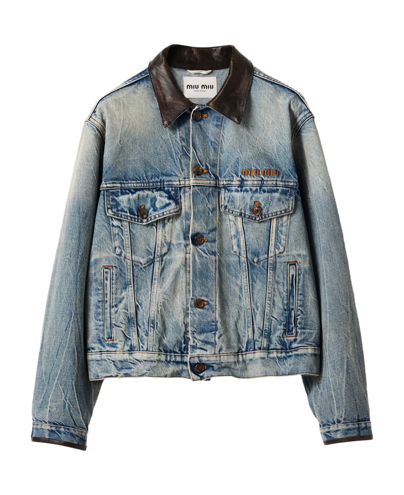 - Made of washed denim - Front button closure - Leather collar - Long sleeves - Buttoned cuffs - Chest pockets - Size shown in photo is 40 - Made in Italy - Designer color: Light blue