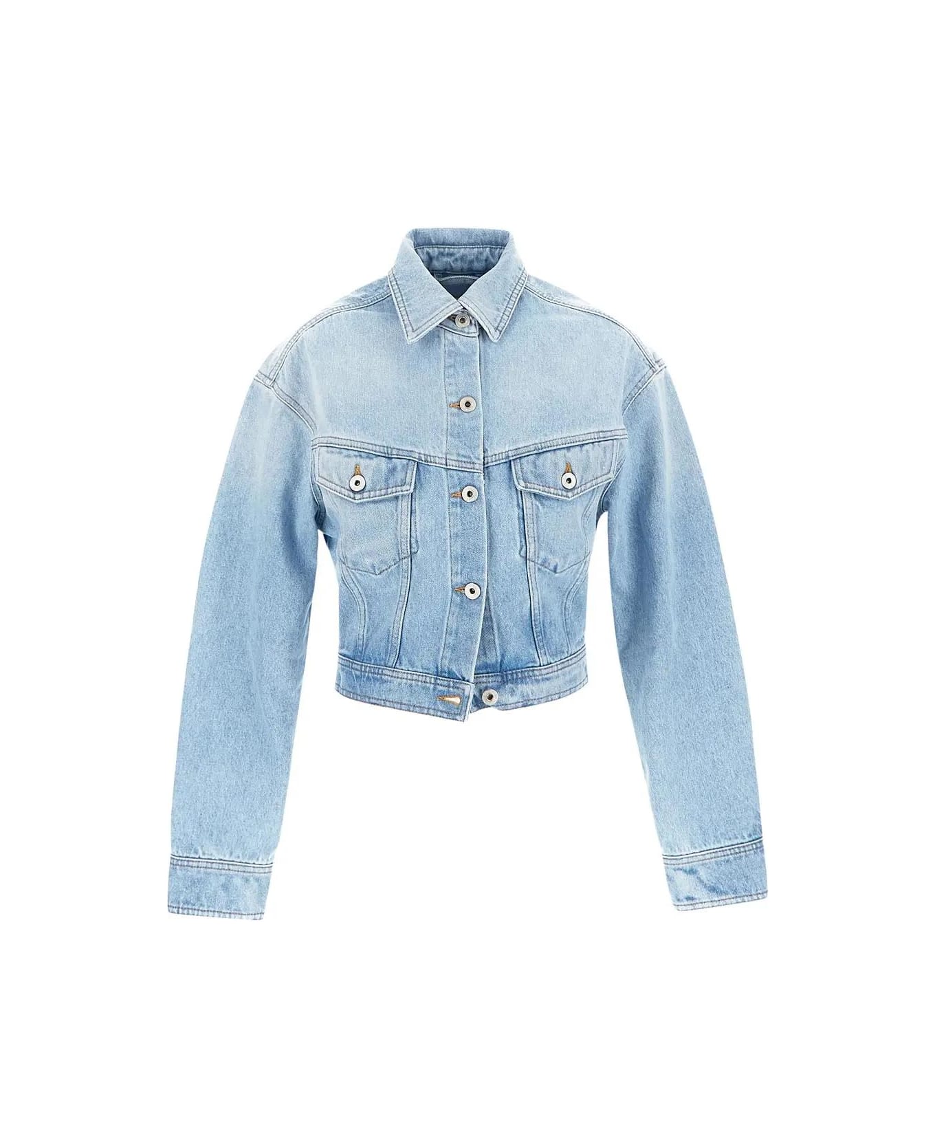Off-White Toy Box jacket in light blue bleach denim cotton featuring pointed collar, long sleeves, cropped length, buttoned cuffs and flap pockets, button closure, contrasting topstitching and back leather patch.
