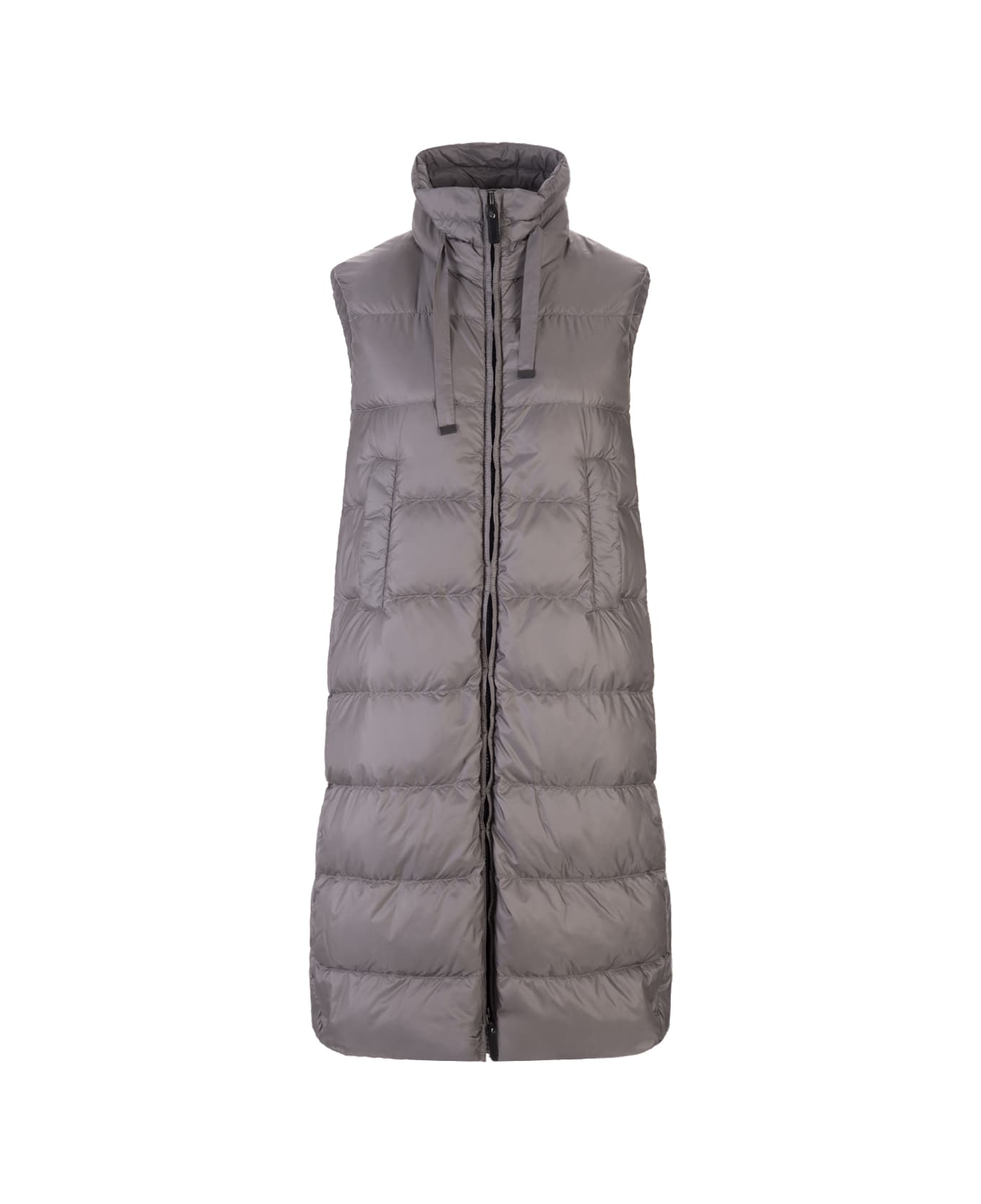 Grey Seivi gilet from Max Mara's The Cube collection made of drip-proof technical canvas, filled with goose down and quilted. Model with high drawstring collar and welt pockets. Front zip fastening. Contains non-textile parts of animal origin.