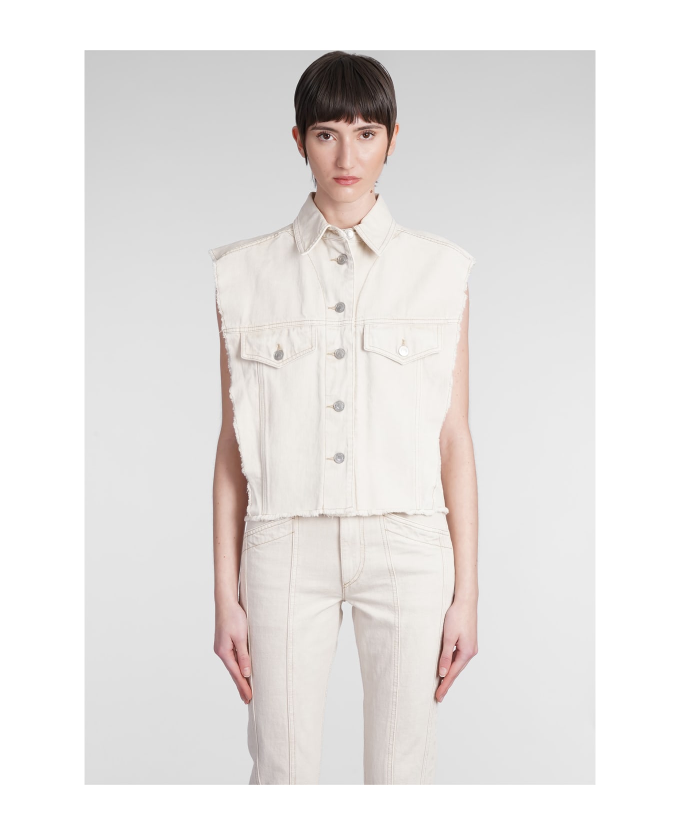 Tyra Vest in beige denim, collar, flap pockets, sleeveless, frayed details, 100% cotton, Made in Morocco, Model is 180 cm and wears 36
