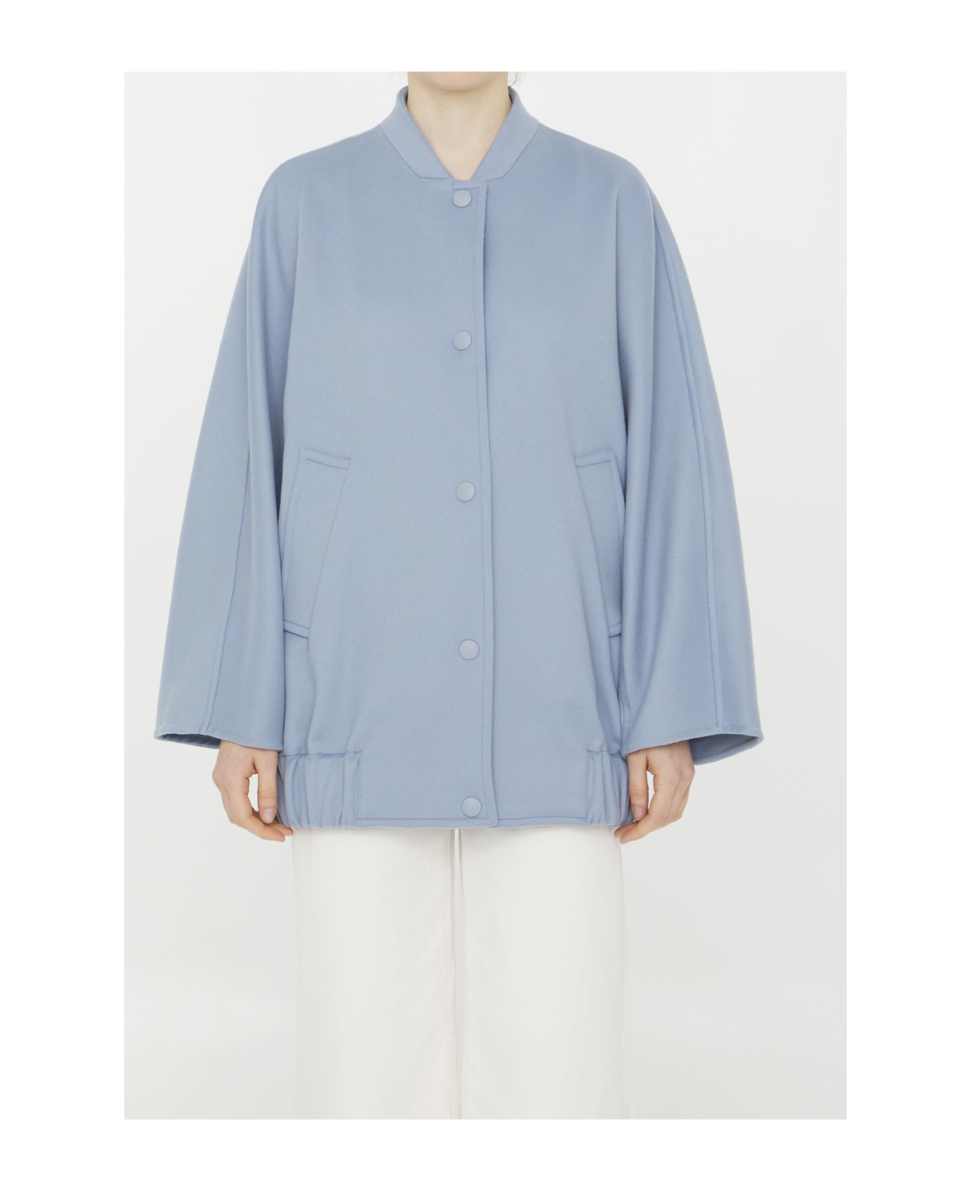 Oversized bomber jacket in soft wool and cashmere blend in the shades of light-blue. It features front press-stud closure, two side welt pockets and stretch hem. The model is 180cm tall and wears size IT 40.
