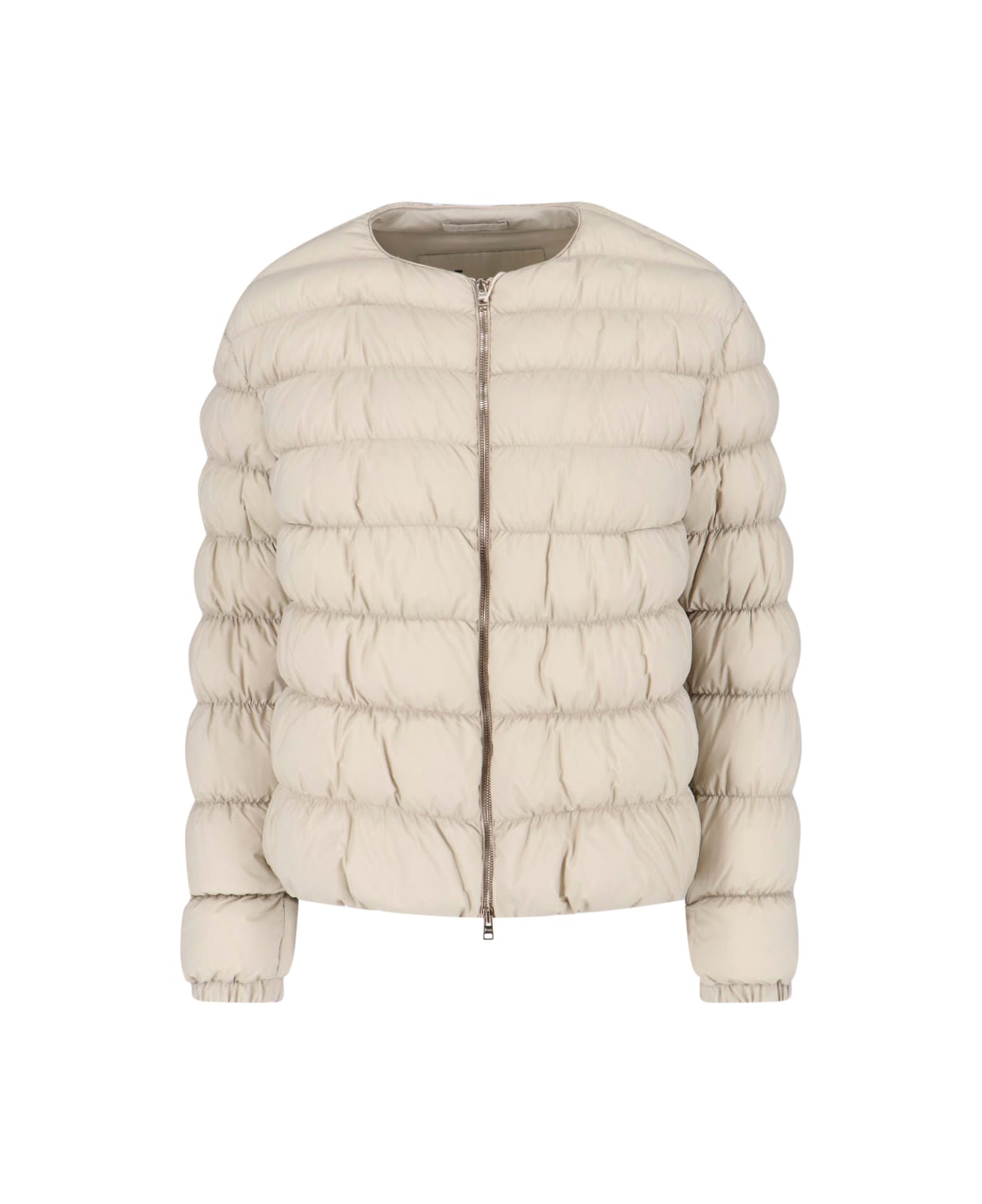 Herno zip down jacket in cream fabric with crew neck, long sleeves, zip closure, gold metal logo tag on the back, elastic trims, straight hem. Composition: 100% Polyamide