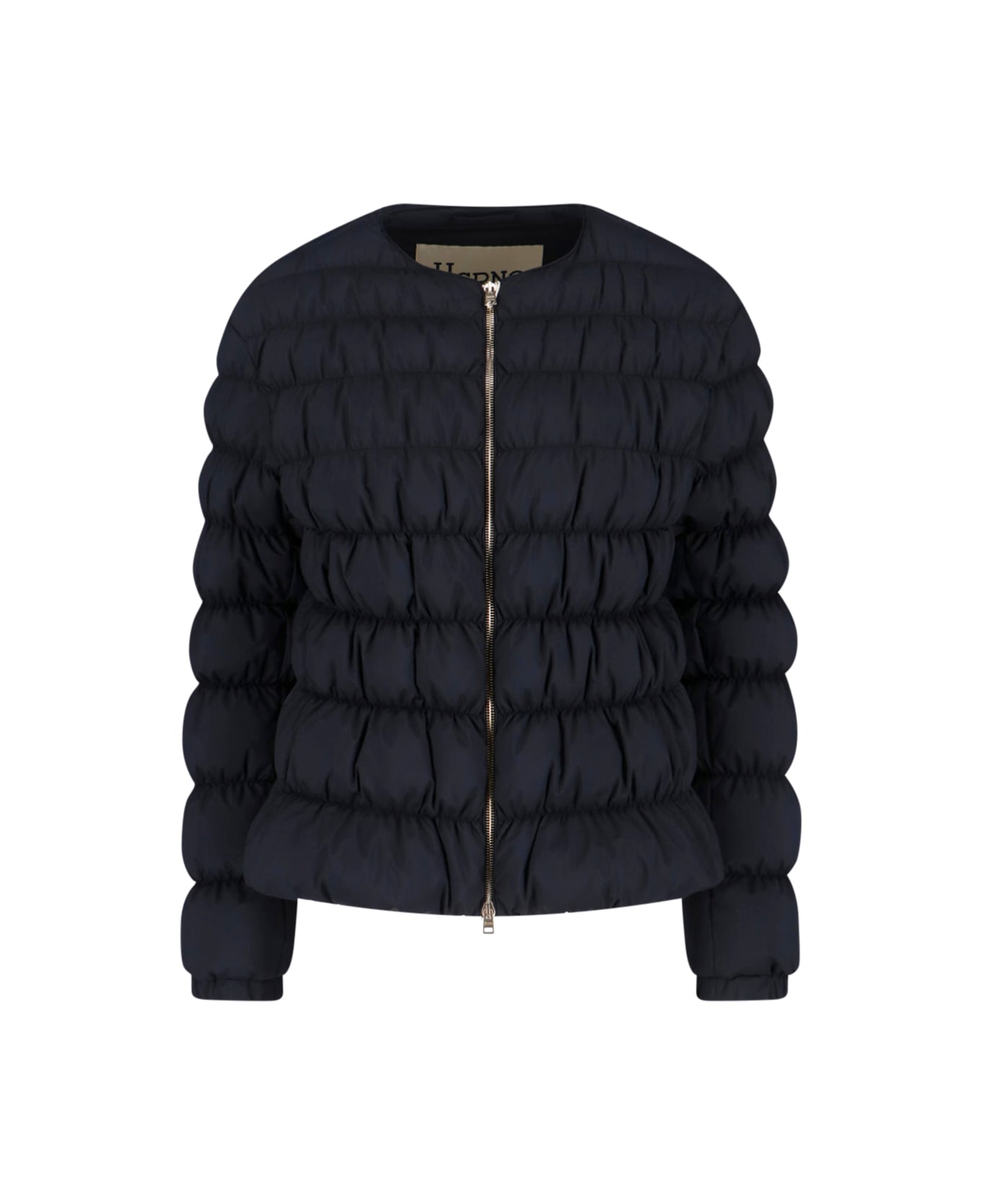 Herno zip down jacket in black fabric with crew neck, long sleeves, zip closure, gold metal logo tag on the back, elastic trims, straight hem. Composition: 100% Polyamide