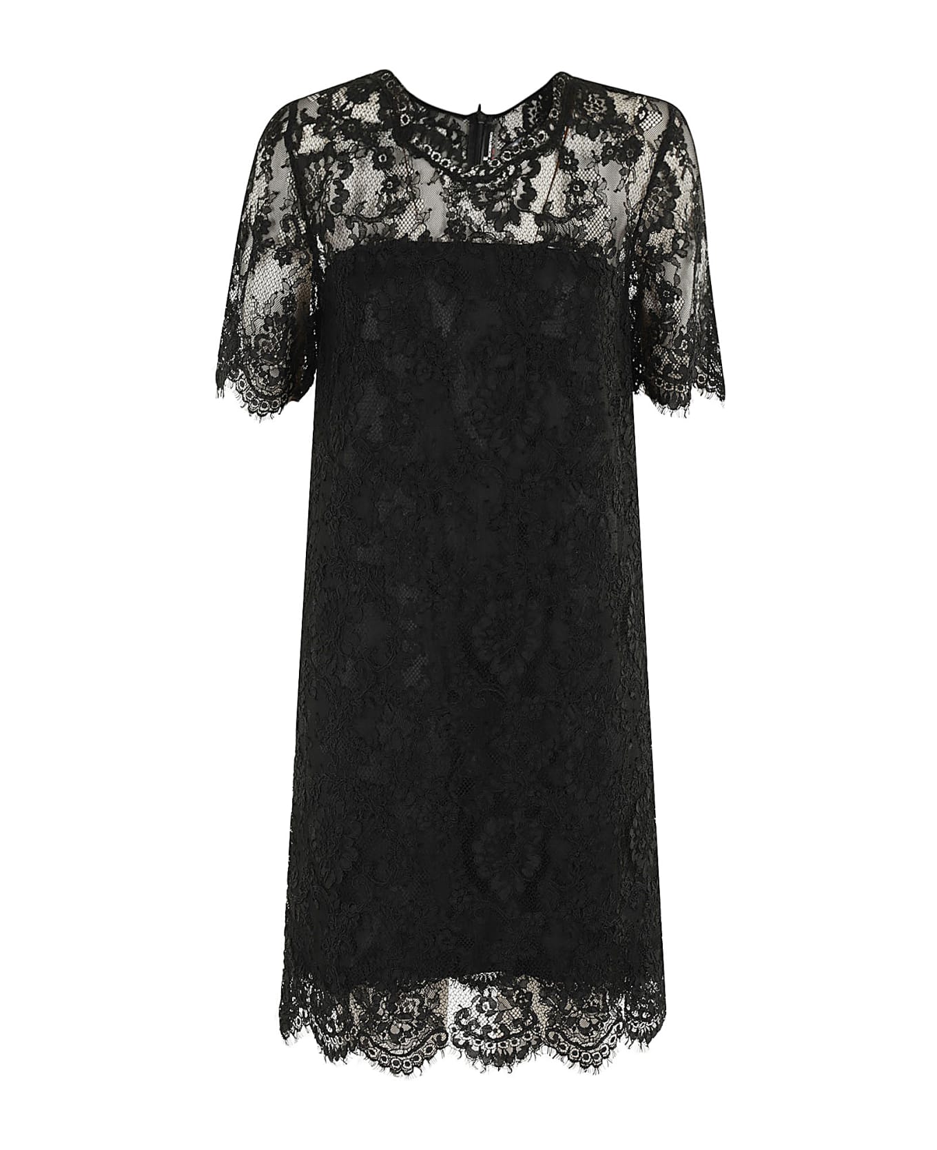 Short Dress - Ermanno Scervino - Black color - Crew neck - Short sleeve - Sheer at the top - Back zipper closure - Embroidered floral print embossed - Above the knee