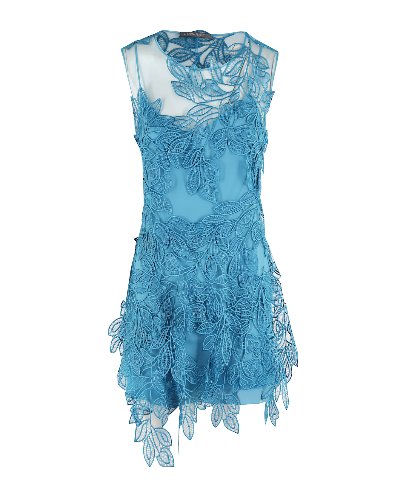 Mini dress -Alberta Ferretti -Blue color -Sleeved -All over embroidery -Asymmetrical length -Small side slits