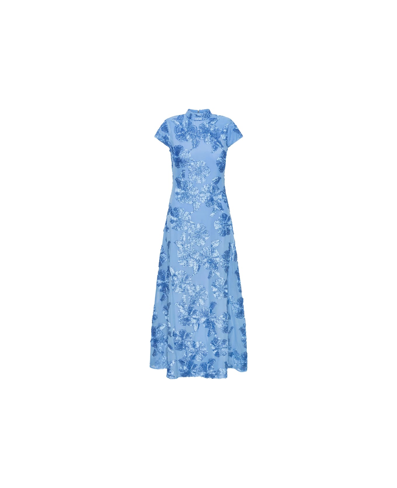 light blue floral embroidery short sleeves mock neck rear zip fastening