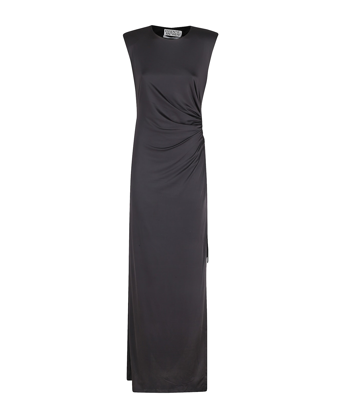 Category: Dress Item: Joye Long Dress Brand: Essentiel Antwerp Color: Black Neckline: Crew neck with padded straps Details: Side cut-out with drawstring, Side slit SIZE AND FIT Fit: Fitted Skirt: Straight