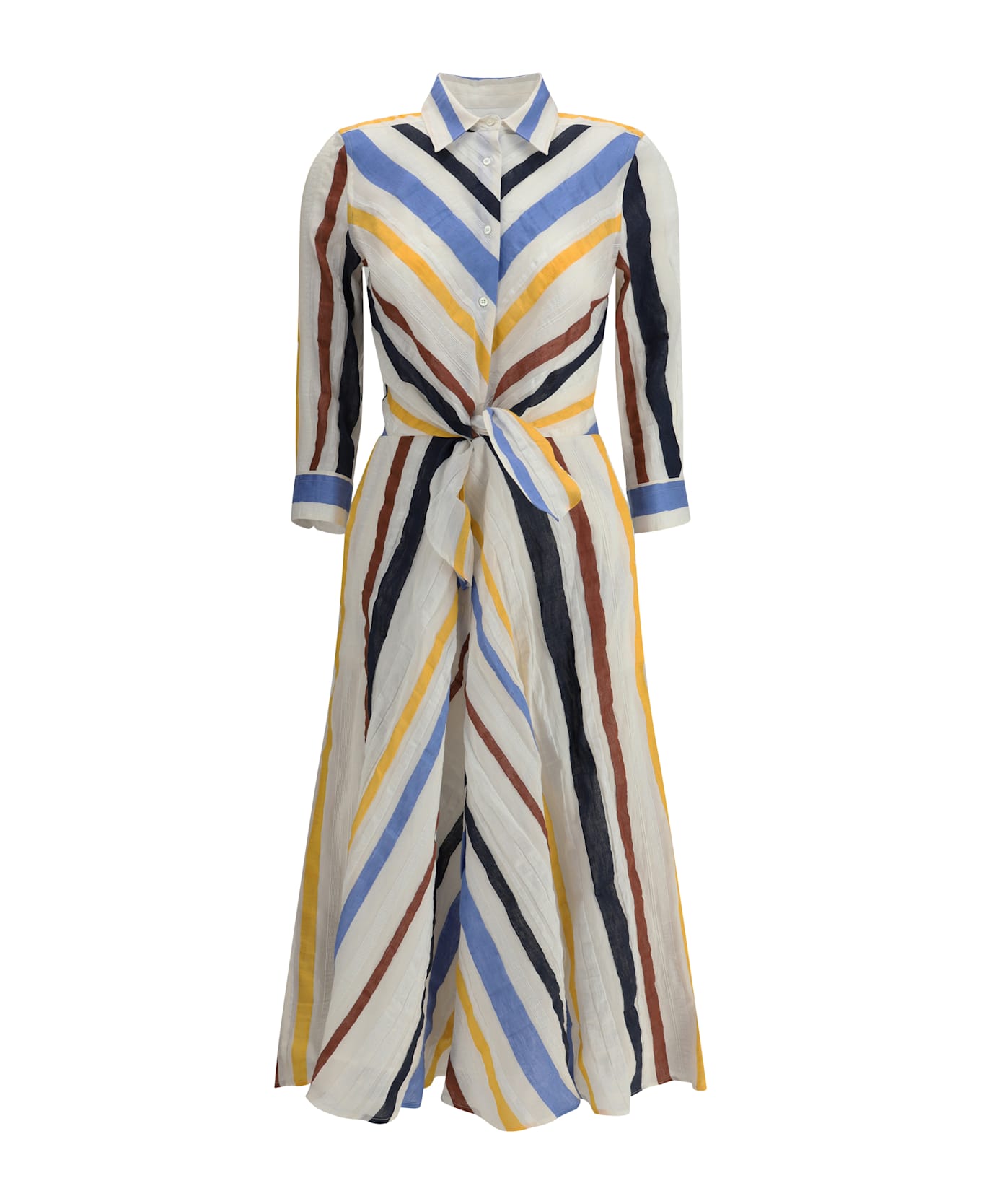 The sara roka long shirt dress is a garment with a timeless and refined charm. the classic collar and the front closure with buttons give a clean and sophisticated line, while the knot detail on the front adds a touch of originality and femininity, elegantly highlighting the waist. the multicolored striped pattern is the real strong point of this dress, which plays with different shades to create a dynamic and lively, but always classy effect. the length of the dress, combined with the shirt design, offers a fluid and comfortable silhouette, perfect for wearing on different occasions, from day to night.