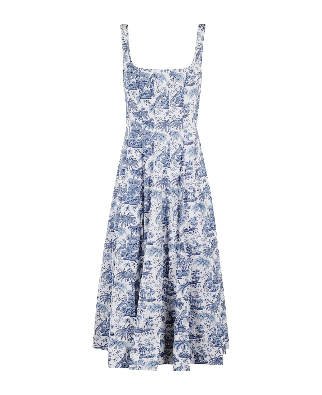 Wells dress - Staud - Blue toile color - Printed cotton poplin fabric - Corset design with straight neckline - Epaulettes - A-line skirt - Back zipper closure - Fitted fit.