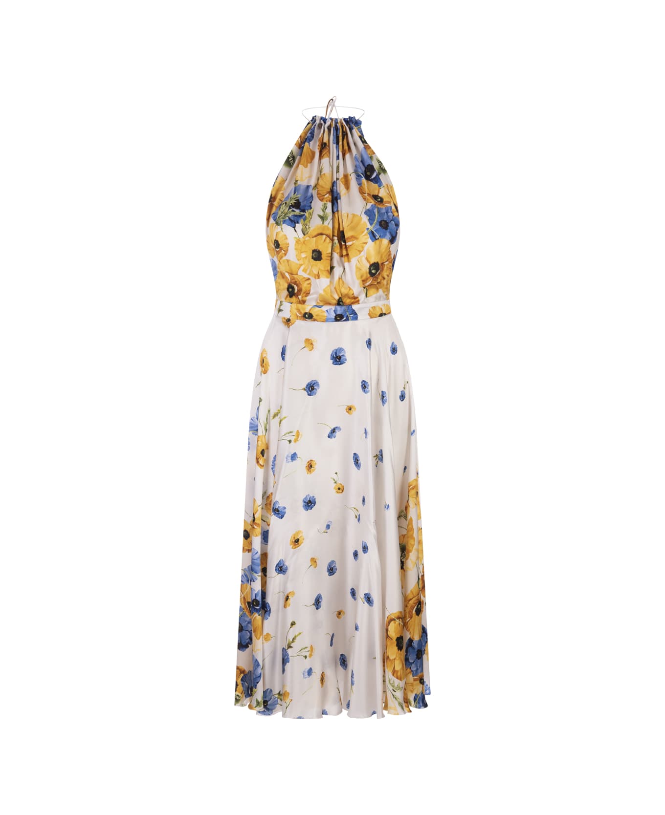 Karla midi dress by Raquel Diniz in fine white silk with all-over Yellow and Blue Blossom print. Model with halter neckline, open back and flared skirt. Concealed zip fastening and back neck fastening.