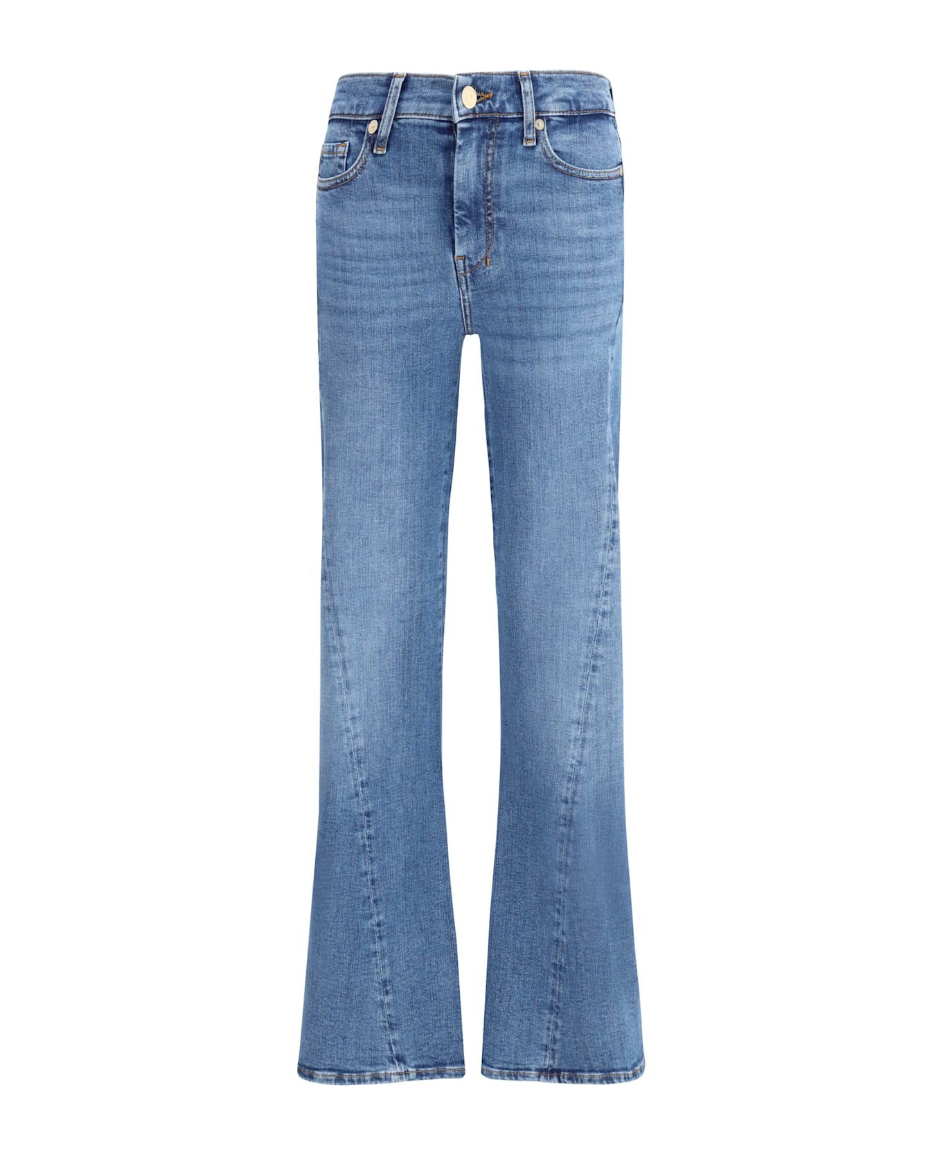 The dojo tailorless flare jeans by 7for feature a mid-rise and a fitted fit on the hips and thighs, opening into a sleek flare from knee to hem. made from slim illusion denim, they offer a shaping effect that enhances the silhouette. a classic five-pocket pattern and zip-and-button closure complete the design.