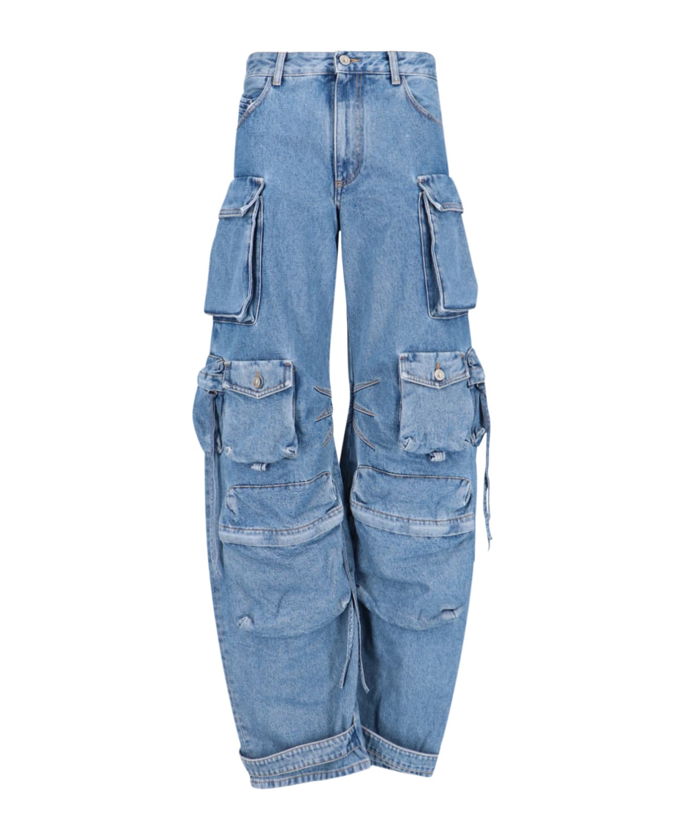 The Attico 'Fern' cargo jeans in blue denim with distressed wash, low waist, belt loops, button and zip closure, five pocket design, fifth pleated pocket detail, various cargo pockets, beige logo patch on the back, beige logo embroidery on the back, straight leg, adjustable straps on the hem.