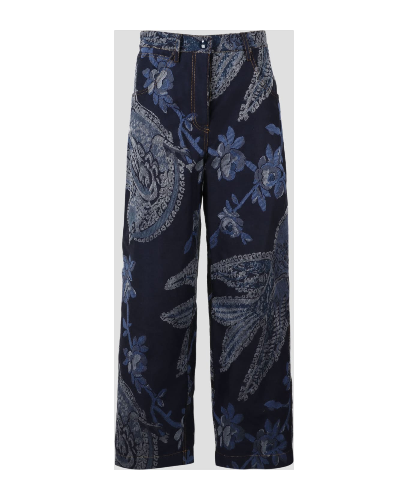 Etro denim jacquard cargo jeans, with floral and bird designs. - SS23 - Loose fit - High waist - 5 Pockets - Zip and hook closure - Hammer loop and side tool pocket - Logo embroidery on the back - Made in Italy - 60% cotton, 40% polyester