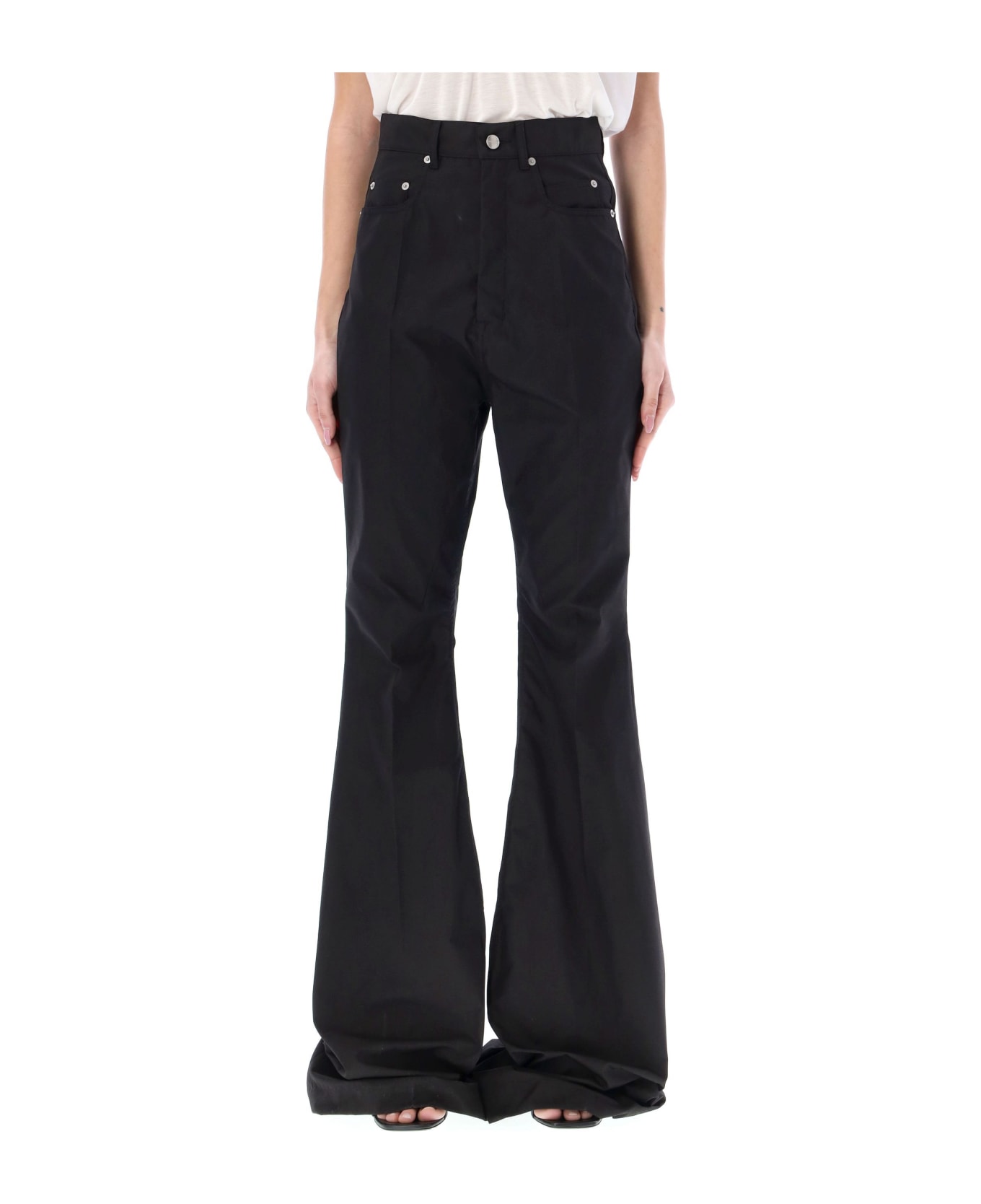Bolan Bootcut By Rick Owens. Featuring: High Waisted Slim Fit Five Pockets Floor Length Boot Cut Button Fastening Belt Loops Back Patch Pockets Central Crease Model Is 1,72 M Tall And She Is Wearing Size 27