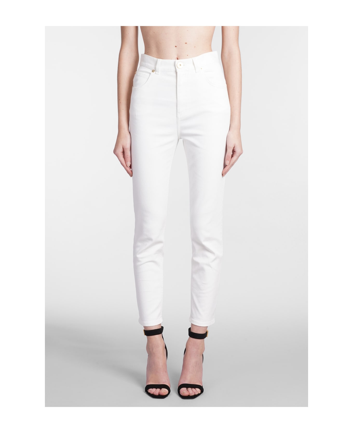 Jeans in white denim, button and zip closure, five pockets, waist belt loops, slim fit, 98% cotton 2% elastane, Made in Italy, Model is 180 cm and wears 36