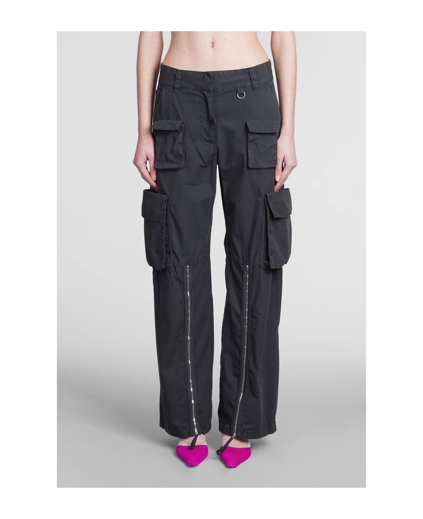 Pants in grey cotton, button and zip closure, zip detail , cargo pockets, waist belt loops, Made in Lithuania, 100% cotton, Model is 180 cm and wears size 34