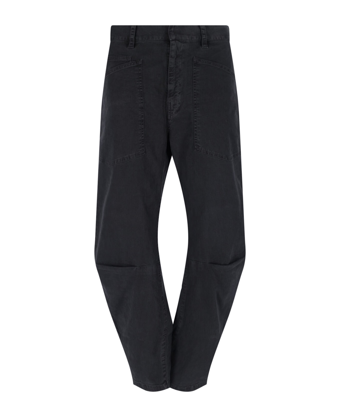 Nili Lotan 'Shon' curved pants in black cotton with mid waist, belt loops, hook and zip closure, five pockets, front pleats, curved leg. Composition: 98% Cotton, 2% Elastane