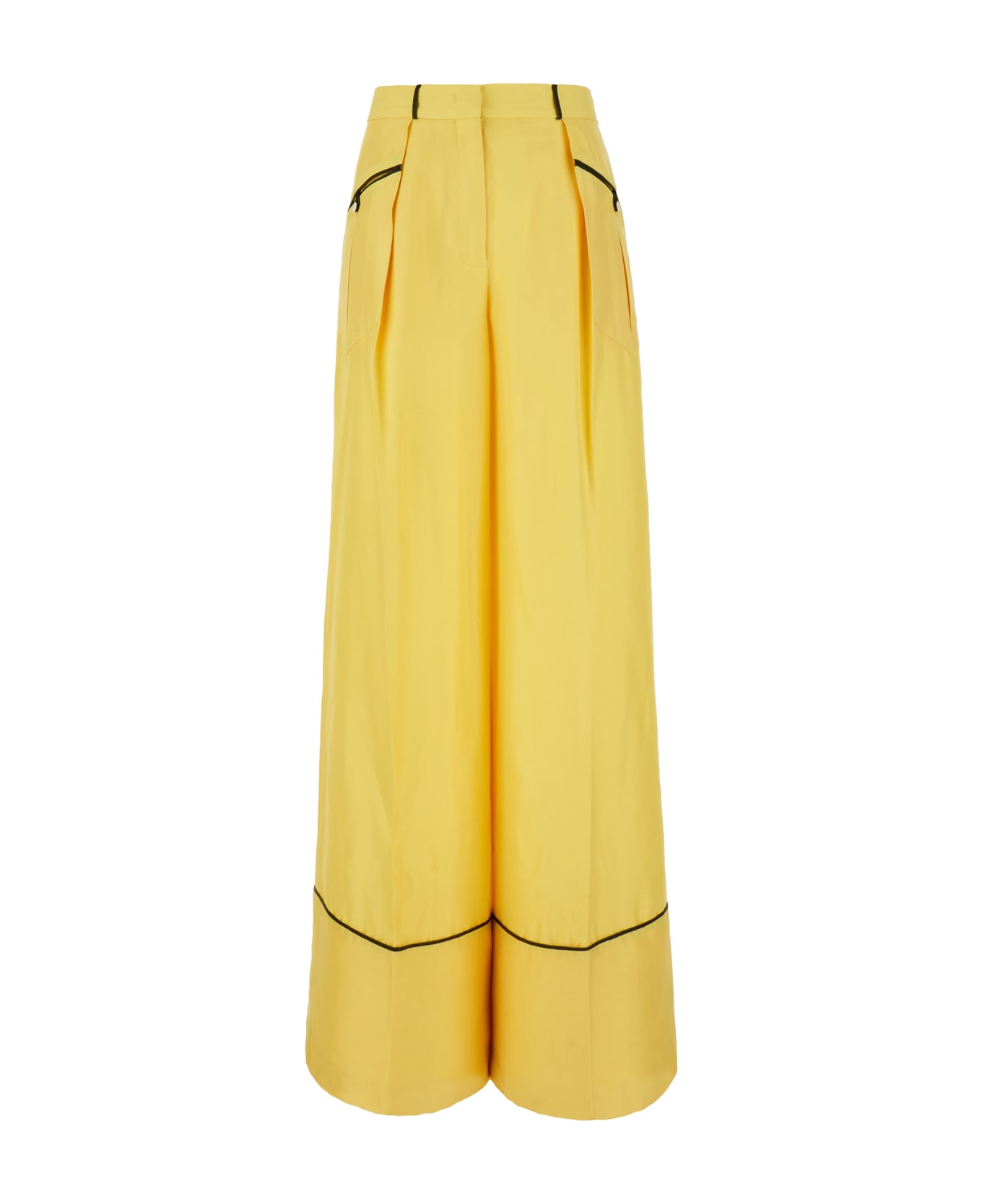 Wide-leg pants realized in pure silk characterized by contrasting trimmings. -Belt loops at the waist -Concealed zip and hook closure at the front -Seam pockets and two patch pockets at the front and two slit pockets at the back -Central ironed pleat