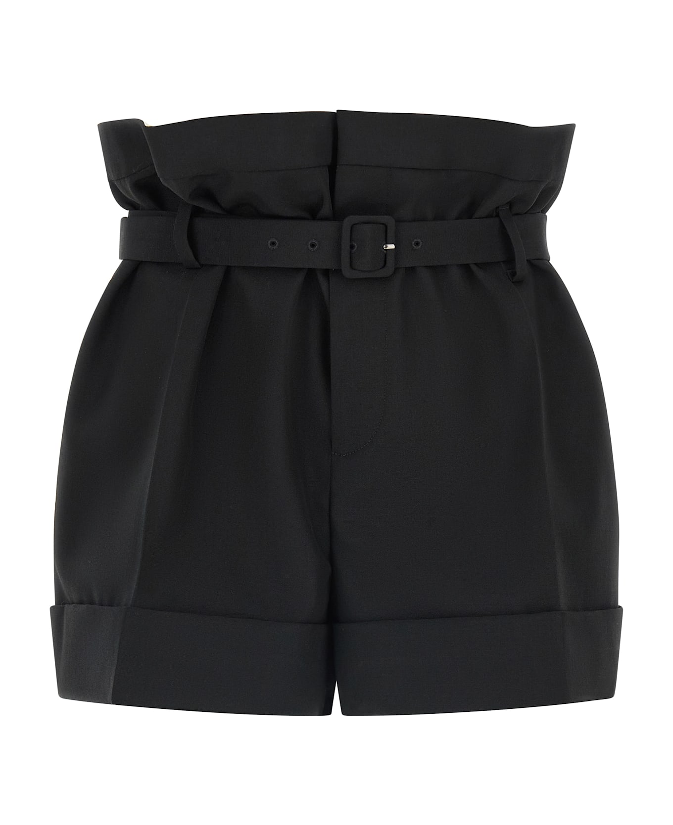 Wool and mohair blend shorts, pouch style, high waist, stretched pleat, button closure and front hook, pockets, turn-up hem, removable matching belt. Composition: 62% mohair 38% wool