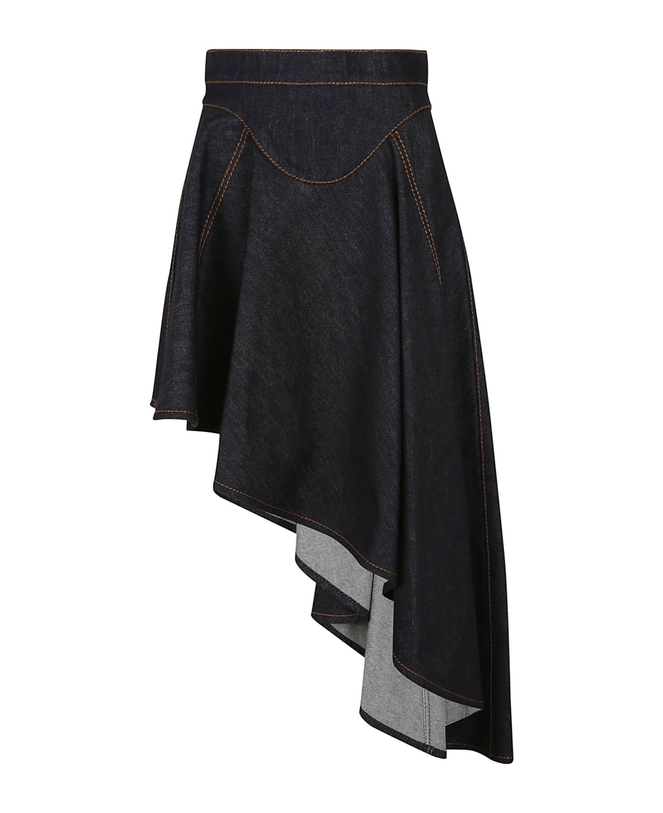 Denim skirt BY ALEXANDER MCQUEEN. High waist; back zip closure. Asymmetrical draping detail and contrast stitching.