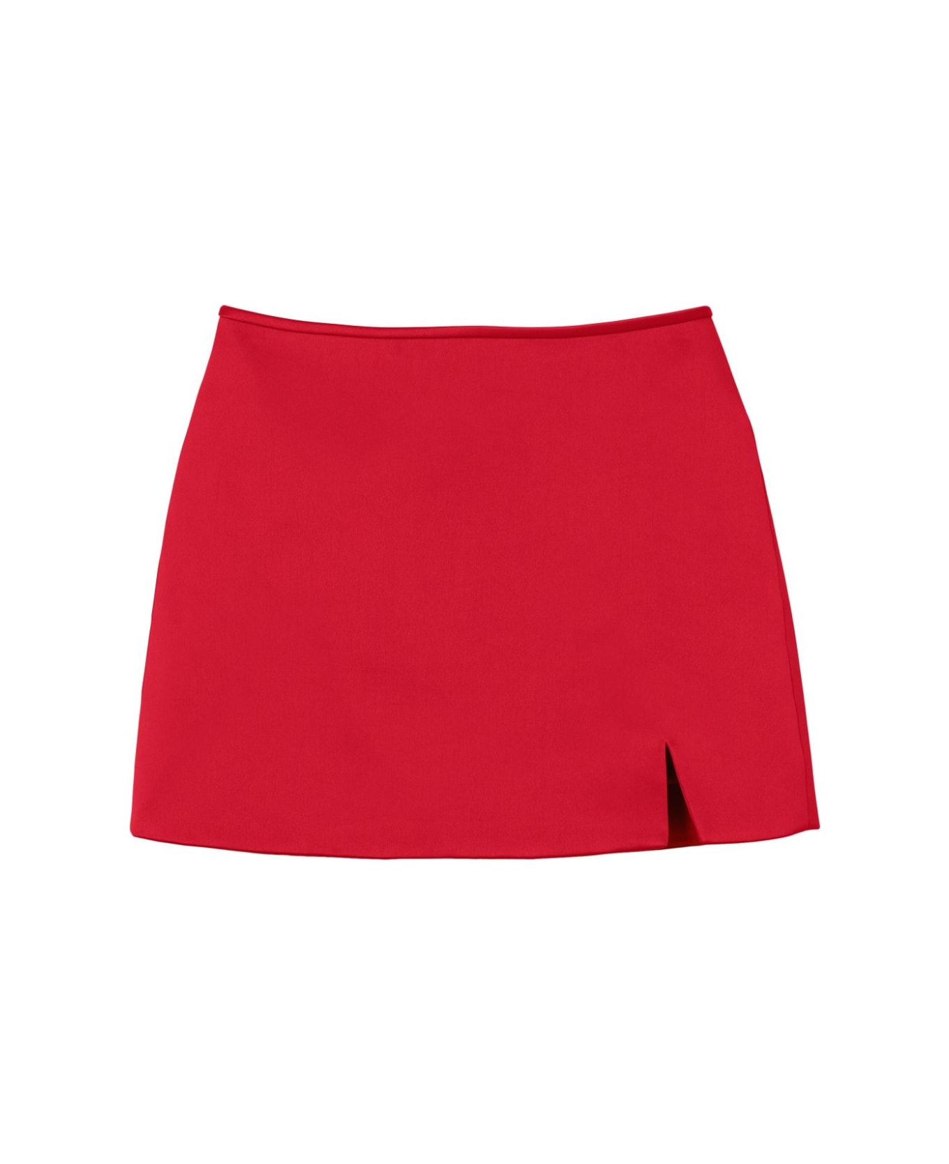 red satin finish bias cut rear zip fastening dart detailing side slit above-knee length