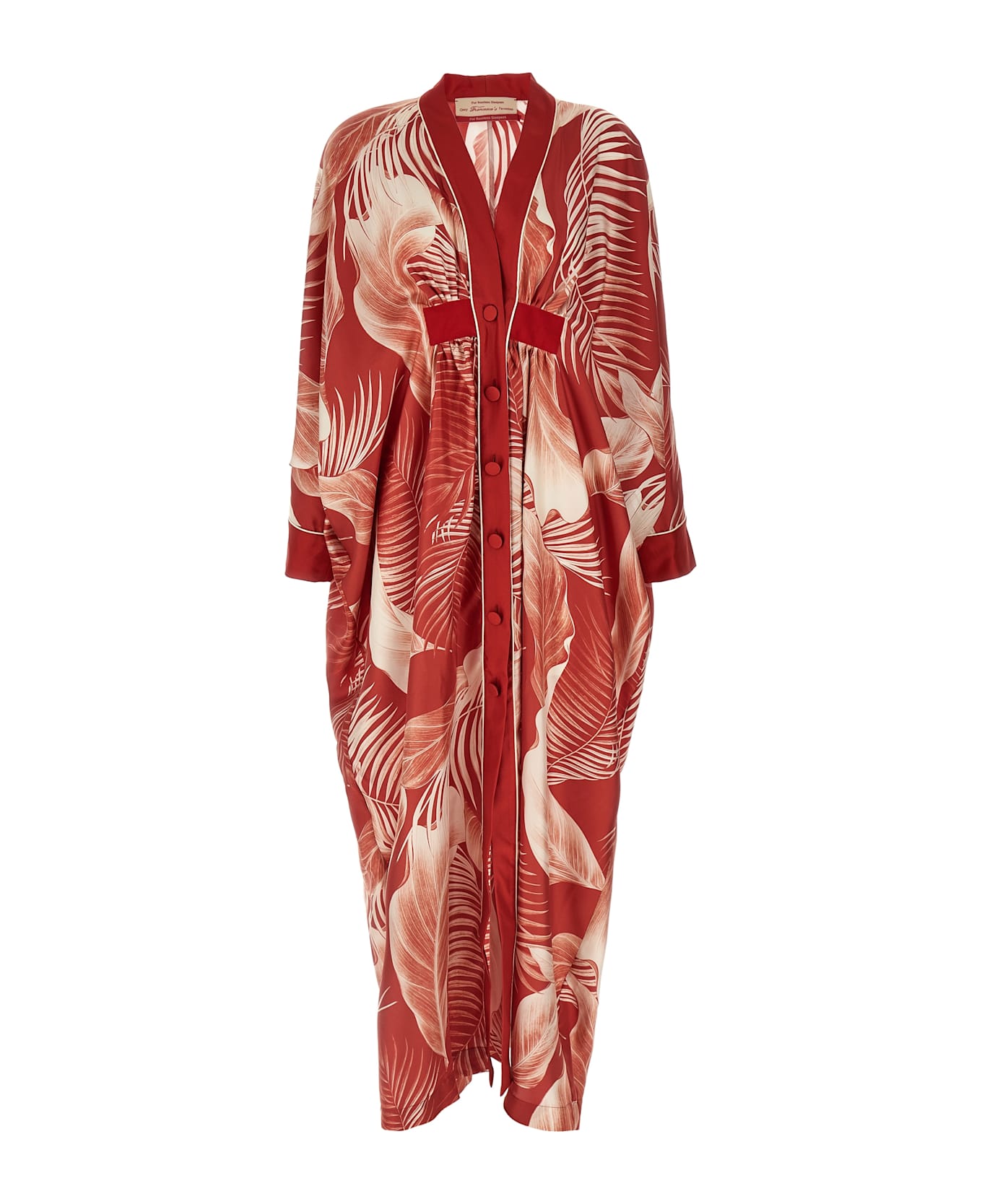 'Icelos' silk dress with leaf and palm print, long style with bat sleeves, front closure with silk-covered buttons, deep V-neck.