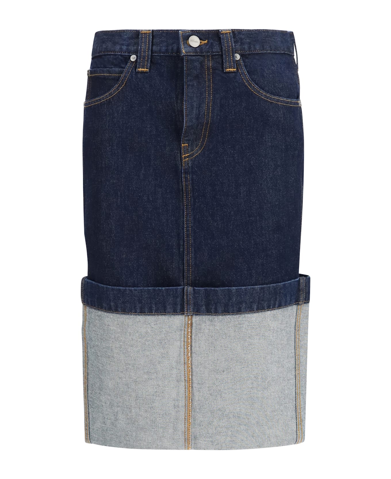 The kilian denim skirt by khaite is a sturdy and sophisticated piece, made from classic indigo denim. with a low waistline, it offers an elongating effect that enhances the silhouette. the five-pocket design is enhanced by a back slit that adds lightness and movement. a basted cuff at the back reveals detailed stitching, while the distinctive button completes the look, adding a unique and refined touch.