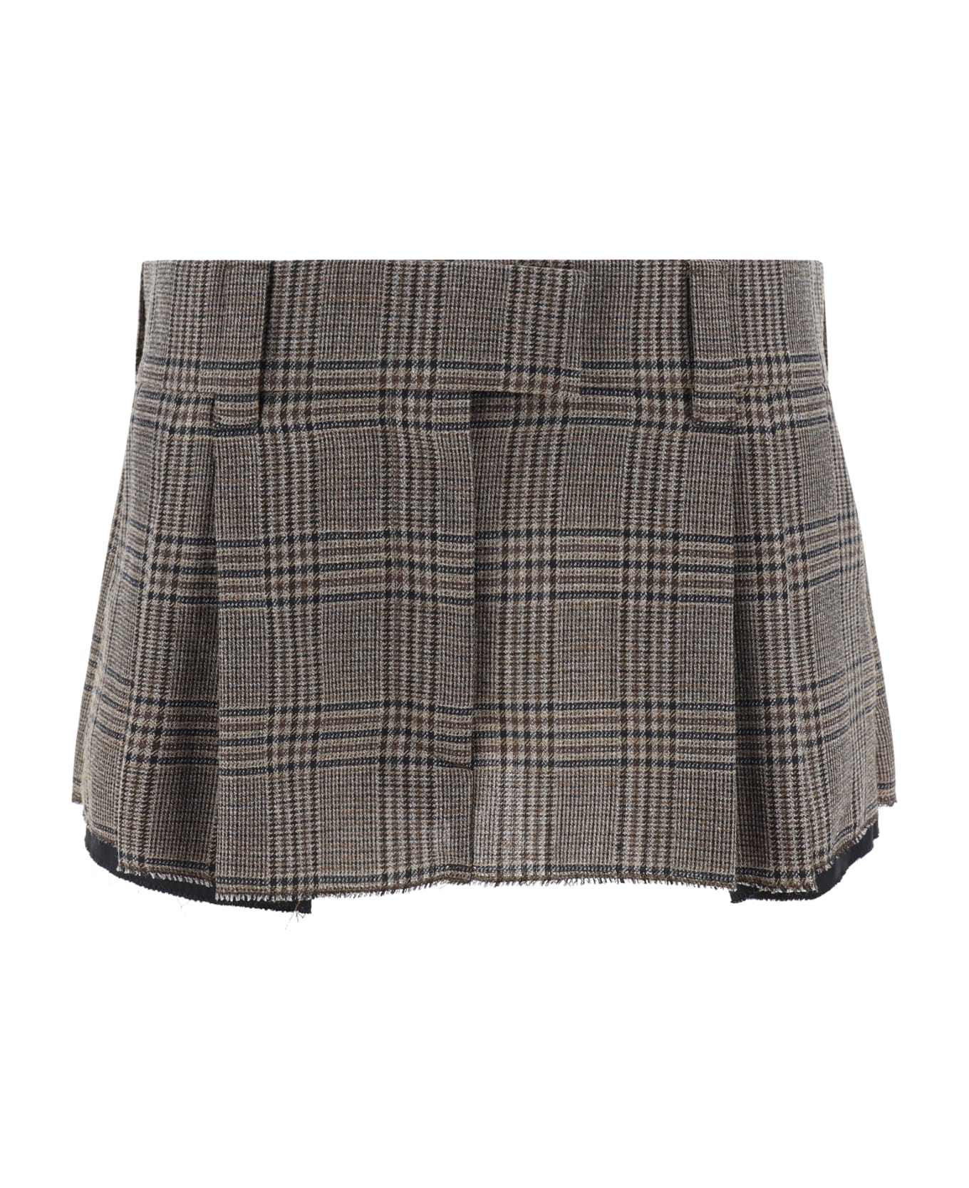 Fleece wool mini skirt by miu miu, tartan-like pattern, a wrap-around design, a front fastening with hooks and concealed buttons, belt loops for waistband, two welt pockets on the back, an embossed iconic brand logo on the back, and a regular fit.
